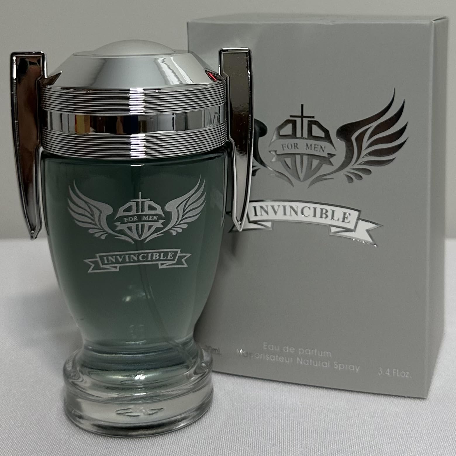 MODERN STYLING: Contemporary green-tinted fragrance housed in a sleek, masculine bottle design. DISTINCTIVE BOTTLE: Features a unique curved silhouette with ribbed chrome top and metallic side accents. VOLUME: Contains 3.4 fluid ounces of eau de parfum natural spray for long-lasting wear. PACKAGING: Comes in a sophisticated white box with matching branding and 'Invincible' signature design. PREMIUM DESIGN: Luxurious men's fragrance presented in an elegant glass bottle with chrome accents and distinctive winged logo emblem.
