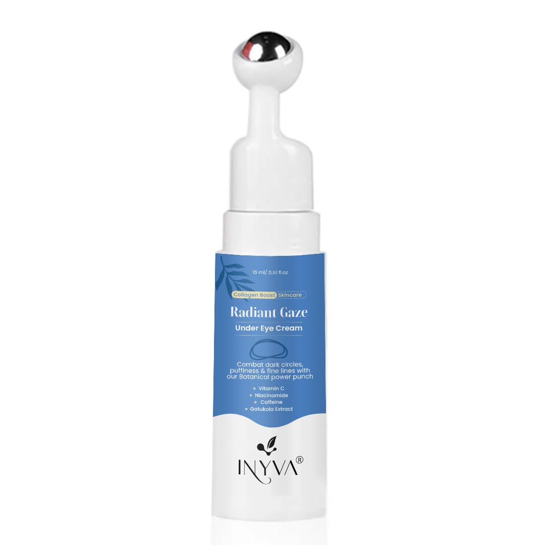 Discover the transformative power of INYVA Radiant Gaze Under Eye Cream, your ultimate solution for brighter, smoother, and revitalized under-eye skin. This expertly formulated cream targets dark circles, puffiness, and fine lines with a potent blend of Vitamin C, Caffeine, Niacinamide, and natural botanical extracts. Each ingredient has been carefully chosen to nourish and enhance the delicate skin around the eyes, ensuring lasting hydration, visible brightness, and firm, youthful results. Dark circles and puffiness don't stand a chance with our 3-O-Ethyl Ascorbic Acid, a stable and potent form of Vitamin C that not only brightens but also shields the skin from harmful environmental stressors. Combined with Amla (Emblica Officinalis) Extract, a rich source of antioxidants, this cream reduces the appearance of dark circles, giving your eyes a fresh and radiant look. Say goodbye to tired eyes with the powerful de-puffing action of Caffeine and Niacinamide. These ingredients work together to smooth fine lines and reduce puffiness, firming the skin and restoring a youthful appearance to your gaze. For those seeking deep hydration, Sodium Hyaluronate and Avocado Oil offer intense moisture, replenishing the under-eye area and helping it stay soft and plump all day. At INYVA, we prioritize natural care. Our Radiant Gaze Under Eye Cream features nourishing oils like Sweet Almond and Olive Leaf Extract, alongside calming Aloe Vera and Centella Asiatica (Cica) extracts. These botanicals provide a soothing experience, making this cream gentle enough for daily use on sensitive skin. Unlike other under-eye creams, INYVA Radiant Gaze includes Papain, a gentle, natural exfoliating enzyme that promotes cell renewal and leaves the skin visibly smoother and brighter without irritation. This unique formula is designed to be effective yet soothing, ensuring that your skin feels as good as it looks. Embrace a refreshed, radiant, and youthful under-eye area with INYVA Radiant Gaze Under Eye Cream—a must-have in any skincare routine.Gentle Enzyme Exfoliation - Papain, a natural enzyme, gently exfoliates dead skin cells, promoting a smoother, brighter under-eye appearance without irritation, suitable for all skin types. Antioxidant Soothing Formula - With powerful antioxidants like Aloe Vera and Olive Leaf Extract, it defends against environmental stressors while soothing and calming sensitive skin. Deep Hydration Nourishment - Infused with Sodium Hyaluronate, Avocado, and Sweet Almond Oils, this cream provides long-lasting hydration and essential nutrients for soft, plump skin. Brightens Reduces Dark Circles - Enriched with Vitamin C (3-O-Ethyl Ascorbic Acid) and Amla Extract to visibly reduce dark circles, bringing a refreshed, radiant glow to the under-eye area for a youthful look. Fights Puffiness Fine Lines - Contains Caffeine and Niacinamide to visibly reduce puffiness and smooth fine lines, firming the delicate under-eye skin for a rejuvenated appearance.