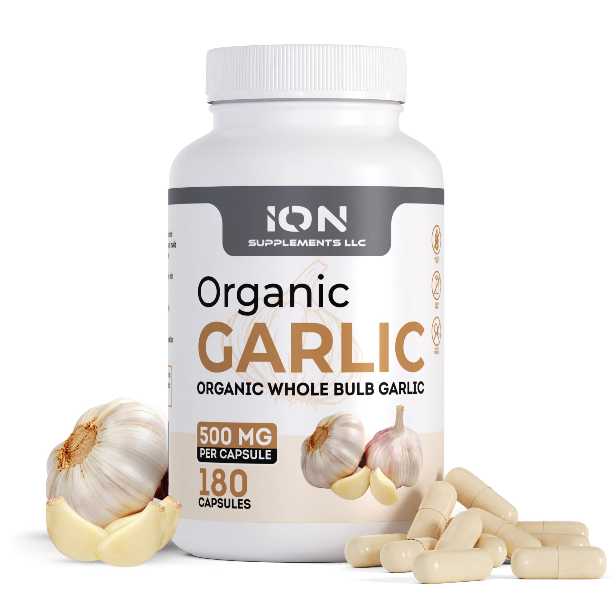 PALEO and VEGAN FRIENDLY - 100 animal free, 100 paleo. DETOXIFICATION SUPPORT - Garlic is a great option for boosting detoxification. Studies have shown that its components help to boost the level of glutathione, which is an important cellular detoxifier. . IMMUNE SUPPORT - All-in-one immune support to provide your body with the boost it needs. Containing antioxidants, this daily dose of garlic is an excellent source of support for whole-body wellness. . CARDIOVASCULAR SUPPORT - Studies show that Garlic contains powerful compounds that support overall heart health, including healthy circulatory function. . NO FILLERS or FLOW AGENTS - You will NOT find binders, fillers, or additives in products sold by Ion Supplements. ORGANIC - Certified organic garlic, manufactured by a cGMP facility, and 3rd party tested for purity and safety.