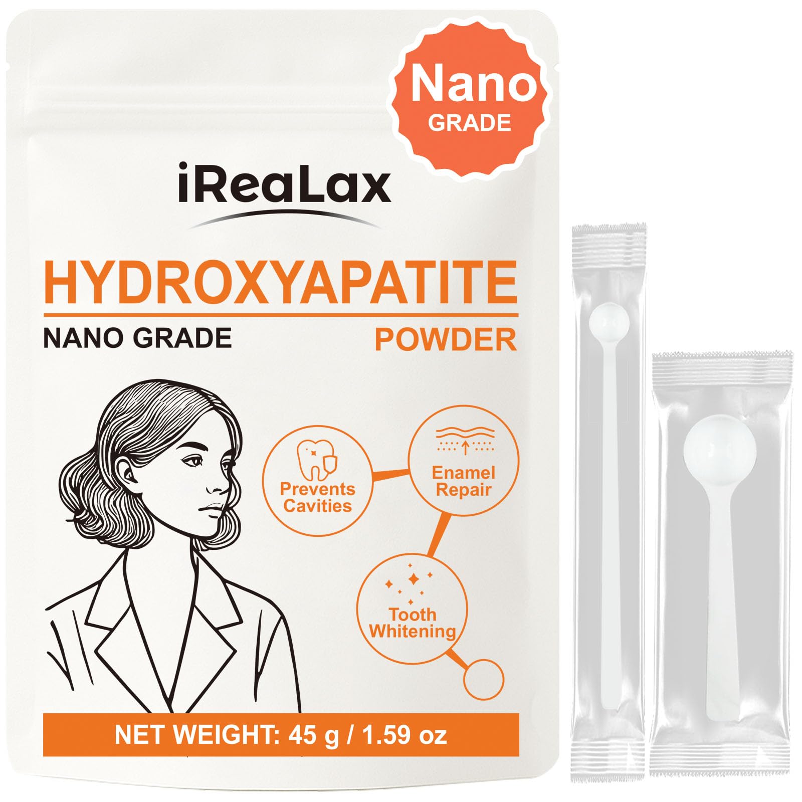 Fluoride-Free Alternative: Hydroxyapatite offers a natural, non-toxic alternative for those who prefer to avoid fluoride or have allergies to it. Strengthen Protect Your Smile Hydroxyapatite (HAp), the key mineral in tooth enamel, helps repair early damage and protect your teeth. Its fine particles fill microscopic enamel pores, forming a strong protective layer that restores enamel, seals sensitivity, and helps prevent cavities—for a naturally healthy, radiant smile. Fluoride-Free Alternative: Hydroxyapatite offers a natural, non-toxic alternative for those who prefer to avoid fluoride or have allergies to it. Enamel Remineralization: Hydroxyapatite helps repair and strengthen enamel by replenishing lost minerals, making it a key component to fight tooth decay. iReaLax 100 Pure Nano Hydroxyapatite Powder, 45g (1.59 oz) with 2PCS free scoops.
