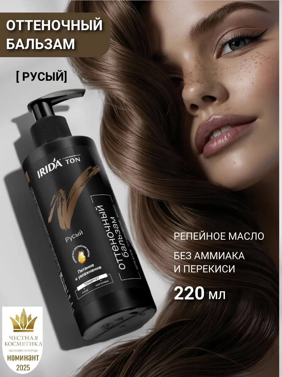 Оттеночный бальзам придаст вашим волосам потрясающий и насыщенный цвет, не повреждая их. Тоник для волос идеально подходит для тех, кто хочет временно изменить образ и готов попробовать новый оттенок. А также отлично подойдет для тонирования волос в желаемый оттенок. В отличие от перманентных красок, этот бальзам для волос смывается через 10-12 процедур мытья головы. Это позволяет часто менять оттенки и экспериментировать с образом. Тонировка для волос придает вашим волосам желаемый оттенок, делая их блестящими и яркими. В отличие от многих красителей, наш тонирующий бальзам не содержит аммиак и перекись водорода, которые могут повредить волосы. Вместо этого он содержит полезное репейное масло для волос, которое, как маска для волос, укрепляет и питает волосы, делает их шелковистыми и блестящими благодаря минералам и антиоксидантам. Уникальный тон «Русый» подойдет для обладательниц русых, каштановых и темно-русых прядей. Данный уход можно использовать для окрашенных волос, он освежит цвет и позволит увеличить время между стойкими окрашиваниями. Для применения бальзама Ирида достаточно нанести его на чистые влажные волосы, оставить на 10 минут для легко оттенка или на 30-40 минут для насыщенного и яркого цвета, затем тщательно смыть. Обращаем Ваше внимание на то, что результат окрашивания зависит от исходного цвета и ранее примененных средств воздействующих на структуру и пигмент волос.