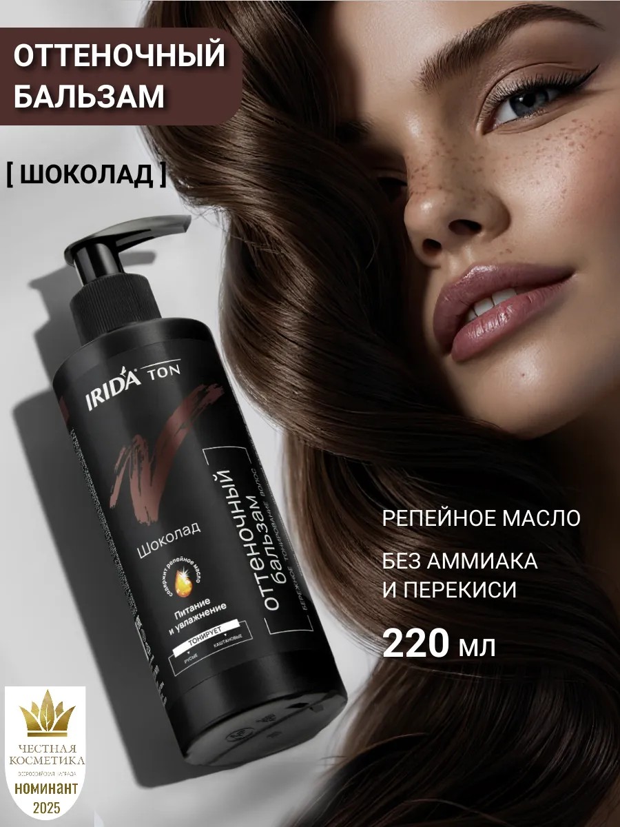 Оттеночный бальзам придаст вашим волосам потрясающий и насыщенный цвет, не повреждая их. Тоник для волос идеально подходит для тех, кто хочет временно изменить образ и готов попробовать новый оттенок. А также отлично подойдет для тонирования волос в желаемый оттенок. В отличие от перманентных красок, этот бальзам для волос смывается через 10-12 процедур мытья головы. Это позволяет часто менять оттенки и экспериментировать с образом. Тонировка для волос придает вашим волосам желаемый оттенок, делая их блестящими и яркими. В отличие от многих красителей, наш тонирующий бальзам не содержит аммиак и перекись водорода, которые могут повредить волосы. Вместо этого он содержит полезное репейное масло для волос, которое, как маска для волос, укрепляет и питает волосы, делает их шелковистыми и блестящими благодаря минералам и антиоксидантам. Уникальный тон «Шоколад» подойдет для обладательниц русых, каштановых и темно-русых прядей. Данный уход можно использовать для окрашенных волос, он освежит цвет и позволит увеличить время между стойкими окрашиваниями. Для применения бальзама Ирида достаточно нанести его на чистые влажные волосы, оставить на 10 минут для легко оттенка или на 30-40 минут для насыщенного и яркого цвета, затем тщательно смыть. Обращаем Ваше внимание на то, что результат окрашивания зависит от исходного цвета и ранее примененных средств воздействующих на структуру и пигмент волос.