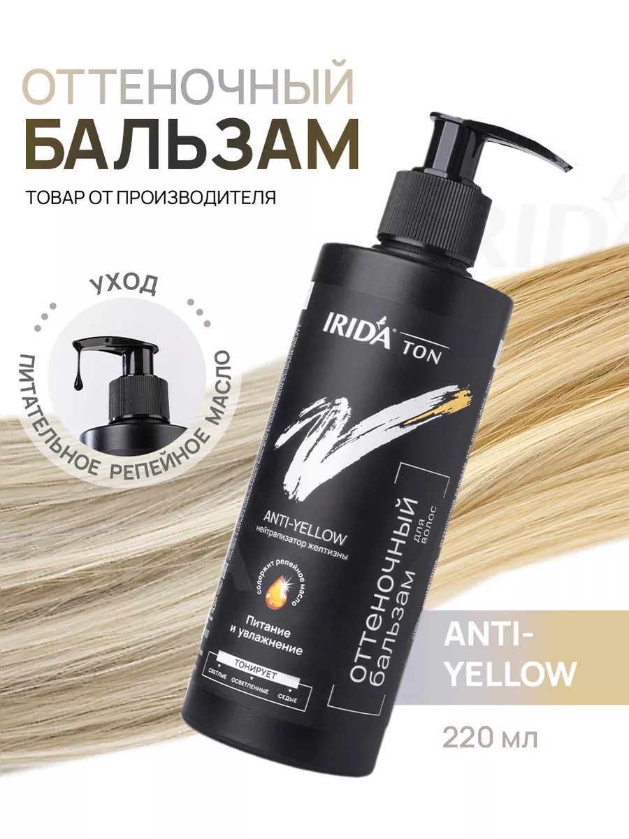 The IRIDA Anti-Yellow Effect Tinted Conditioner is a professional product for neutralizing, toning, and caring for bleached and lightened hair. A care product for toning and maintaining hair color! The professional formula is free of harmful ammonia and hydrogen peroxide. It includes vitamin-rich burdock oil, which nourishes and moisturizes. The Anti-Yellow Effect toning conditioner for highlighted and bleached hair provides a beautiful tone. This toning conditioner is suitable for natural, colored, and bleached hair. It can be used at home and in salons. The toning effect is temporary: the resulting shade washes out after 3-5 washes. This toning product is an excellent choice for a quick transformation for blondes and adult women with gray hair. The 220 ml volume is enough for many treatments. The product is suitable for toning and temporary coloring of straight and curly hair.