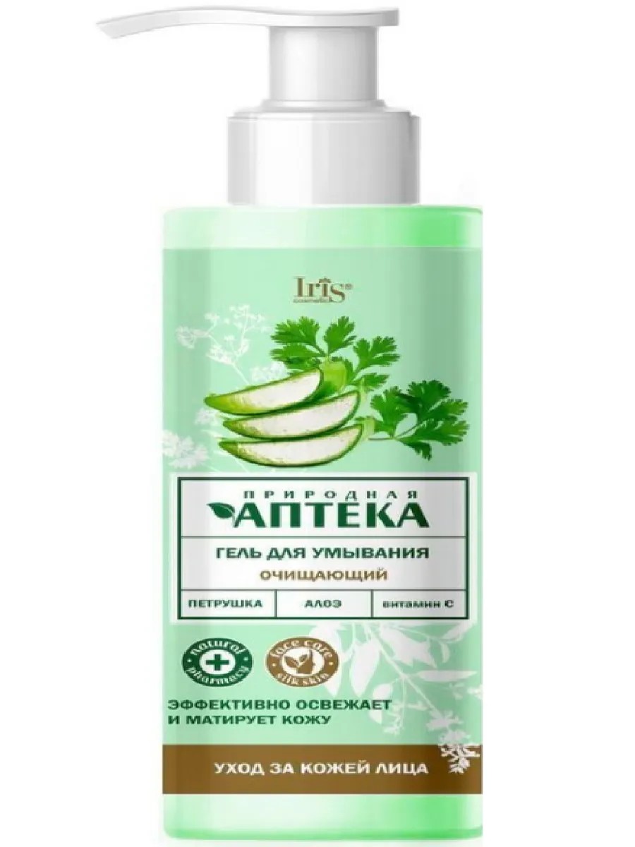 IRIS, Гель для умывания очищающий серии - Природная аптека, флакон 190 мл. Сбалансированная формула геля мягко и эффективно очищает кожу от загрязнений, излишков себума и макияжа. Экстракт петрушки, экстракт алоэ, витамин С предотвращают: пересушивание, минимизируют нежелательный жирный блеск, помогают очистить и сузить поры, освежают, делают кожу гладкой и здоровой. Применение: нанести небольшое количество средства на влажную кожу, помассировать легкими круговыми движениями, смыть теплой водой.