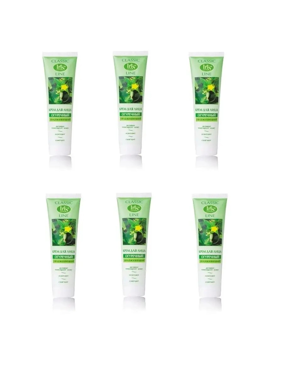 Легкий увлажняющий крем для ухода за кожей лица любого типа в комплекте 6 штук по 100мл. Экстракт огурца оказывает активное тонизирующее действие, увлажняет и освежает кожу, устраняет отечность, осветляет, помогает восстановить упругость, гладкость, эластичность кожи. Применение: нанести крем на чистую кожу лица легким массажем по линиям наименьшего растяжения кожи.