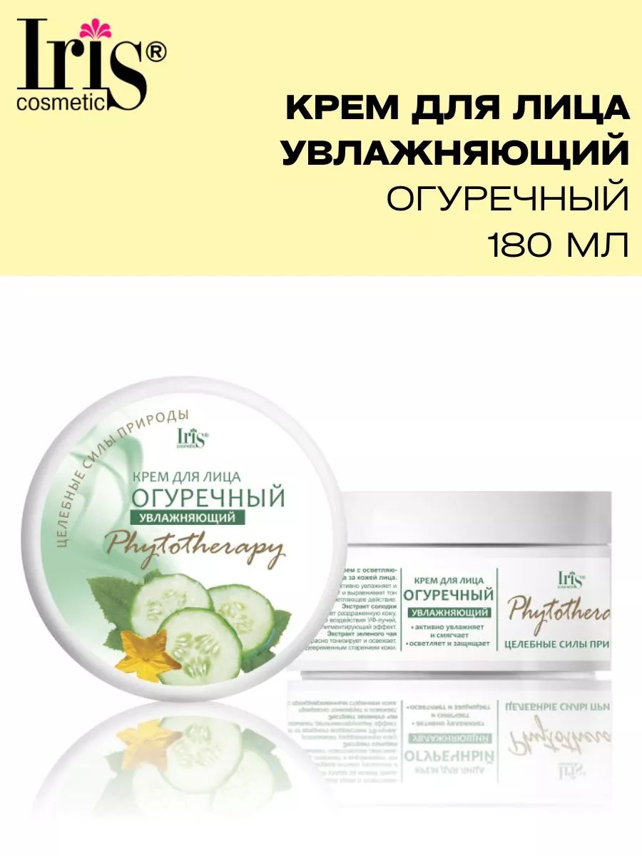 Крем для лица Огуречный серии Phytotherapy бренда Iris Cosmetic Белорусской уходовой косметики для женщин обеспечивает интенсивное увлажнение и защиту. Лёгкий увлажняющий крем для ухода осветляет и смягчает, повышает тонус и упругость, возвращая естественную красоту. Входящее в состав экстракт огурца активно увлажняет и смягчает, освежает и выравнивает тон, обладает осветляющим действием. Экстракт солодки успокаивает раздражённую кожу, защищает от вредного воздействия окружающей среды и УФ лучей, оказывает депигментирующий эффект. Экстракт зелёного чая прекрасно тонизирует и освежает, борется с преждевременным старением. Кремовая текстура быстро впитывается и не оставляет неприятные ощущения липкости и стянутости. Для эффективного применения нанесите на очищенную кожу лица, вбивая кончиками пальцев до полного впитывания.