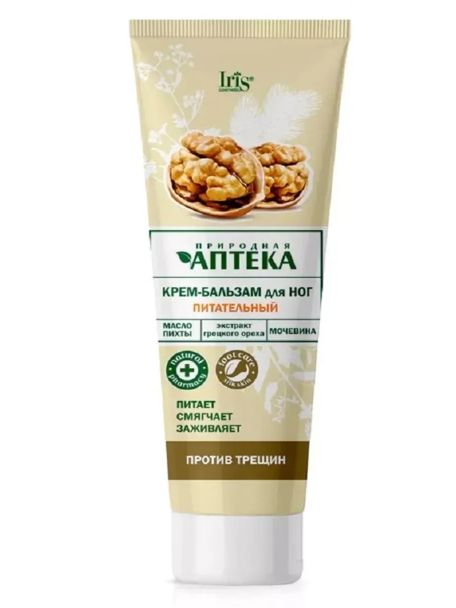 Iris Природная аптека Крем-бальзам для ног питательный 100 мл, 1 штука. Заживляет Смягчает Питает Живительный крем-бальзам интенсивно питает и регенерирует кожу ног. Масло ШИ, входящее в его состав, увлажняет и смягчает кожу, а благодаря витаминам A, D и Е повышается ее упругость и эластичность. Масло авокадо устраняет сухость и шелушение, делает кожу мягкой, нежной и бархатистой. Крем-бальзам рекомендуется для ежедневного ухода за ногами. Состав: Масло ШИ, масло авокадо, витамины A, D и Е.