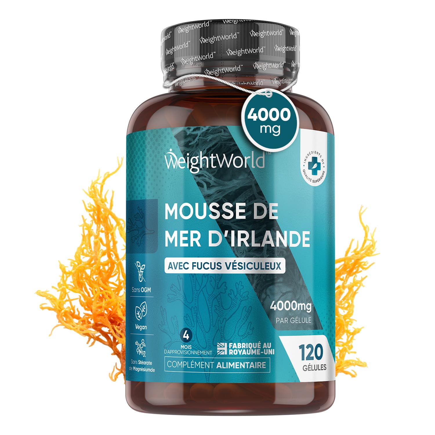 DISCOVER WEIGHTWORLD - A British family business, we draw on over 18 years of experience in creating food supplements for your well-being. We ensure that we always offer quality products with naturally sourced ingredients that comply with Good Manufacturing Practice (GMP) standards. VEGAN PRACTICAL - Our experts have formulated Irish Sea Moss with naturally sourced ingredients, free from GMOs and magnesium stearate. The capsules are an excellent alternative: they are easy to swallow, with superior absorption and no aftertaste to provide you with all its benefits. They are suitable for vegan and vegetarian diets. SOURCE OF MINERALS - Irish Sea Moss is also rich in minerals such as iodine, which contributes to normal energy-yielding metabolism and normal cognitive function. Magnesium helps reduce tiredness and fatigue and contributes to electrolyte balance. Its high potassium content contributes to the normal functioning of the nervous system and muscles. SOURCE OF VITAMINS - Irish Sea Moss is an excellent source of vitamins such as vitamins A, B, C, E and K. According to EFSA, vitamin A contributes to normal iron metabolism as well as the maintenance of normal skin and vision. In addition, vitamin C contributes to normal collagen formation for the normal function of cartilage and bones. WHY CHOOSE OUR IRISH SEA MOSS? - Our Irish Sea Moss is the food supplement you need if you want to find a daily balance. Indeed, our 120 capsules are composed of a dose of 4000mg per serving of Irish Sea Moss to provide you with all the benefits of this powerful algae for 4 months.DÉCOUVRIR WEIGHTWORLD - Entreprise familiale britannique, nous mettons à contribution plus de 18 ans d'expérience dans la création de compléments alimentaires pour votre bien-être. Nous nous assurons de toujours proposer des produits de qualité aux ingrédients d'origine naturelle qui respectent les normes de Bonnes Pratiques de Fabrication (GMP). VEGAN PRATIQUE - Nos experts ont formulé une mousse de mer d'Irlande à base d'ingrédients d'origine naturelle, sans OGM ni stéarate de magnésium. Les gélules sont une excellente alternative : elles sont faciles à avaler, avec une absorption supérieure et sans arrière goût pour vous apporter tous ses bienfaits. Elles sont adaptées aux régimes vegan et végétarien. SOURCE DE MINÉRAUX - La irish sea moss est aussi riche en minéraux tels que l'iode qui contribue à un métabolisme énergétique normal et une fonction cognitive normale. Le magnésium quant à lui aide à réduire la fatigue et l'épuisement et participe à l'équilibre électrolytique. Sa richesse en potassium contribue au fonctionnement normal du système nerveux et des muscles. SOURCE DE VITAMINES - La mousse de mer d'Irlande est une excellente source de vitamines tels que les vitamines A, B, C, E et K. Selon l'EFSA, la vitamine A contribue au métabolisme normal du fer ainsi qu'au maintien d'une peau et d'une vision normales. De plus, la vitamine C contribue à la formation normale de collagène pour le fonctionnement normal du cartilage et des os. POURQUOI CHOISIR NOTRE MOUSSE DE MER D'IRLANDE ? - Notre mousse de mer d'Irlande est le complément alimentaire qu'il vous faut si vous souhaitez retrouver un équilibre quotidien. En effet, nos 120 gélules sont composées d'une dose de 4000mg par portion d'irish sea moss afin de vous apporter tous les bienfaits de cette algue puissante pendant 4 mois.
