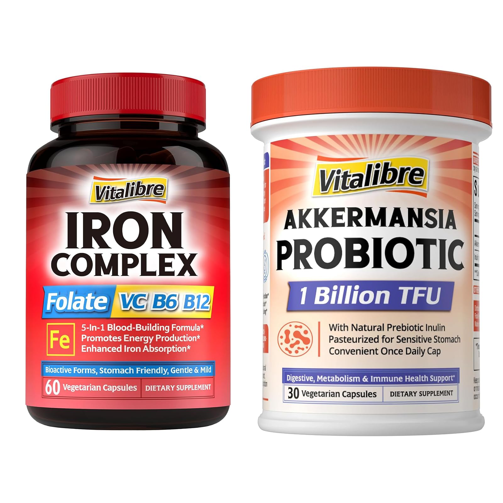 High Quality And Value: We are proud to affirm all Vitalibre products are manufactured in the U.S in facilities that adhere to strict Good Manufacturing Practices (GMP) guidelines. Every Vitalibre product is tested by qualified third parties including Labdoor, NSF and Eurofins for the highest quality. Leaky Gut Supplement GLP-1 Production : Vitalibre Akkermansia supports healthy digestive function as it restores, protects, and strengthens the gut lining by replenishing its mucus lining. It also produces important short-chain fatty acids to suppor GLP-1 production. . 1 Billion TFU Akkermansia with Prebiotic Inulin: Our Akkermansia Probiotic is formulated with 1 billion TFU pasteurized Akkermansia muciniphila and natural prebiotic inulin to create a diverse and healthy gut flora ecosystem. . 5-IN-1 Blood-Building Formula : Our gentle iron pills provide the most natural and bioactive forms of blood vitamins including 667 mcg folate (as L-5-MTHF), 30 mcg of methyl B12, and 5 mg of bioactive B6 (P-5-P), the vital nutrients required for hemoglobin formation and red blood cell production, along with 30 mg of natural vitamin C to enhance iron absorption. . Non-Constipating Iron Bisglycinate: Vitalibre Iron Complex provides 36 mg of elemental iron in a gentle, well-absorbed form as iron bisglycinate (ferrous bisglycinate), which boosts your iron levels without unwanted digestive issues like nausea or constipation. This iron supplement is great for individuals with increased iron needs, such as menstruating women, pregnant women, vegans, vegetarians, athletes recent blood donors. .