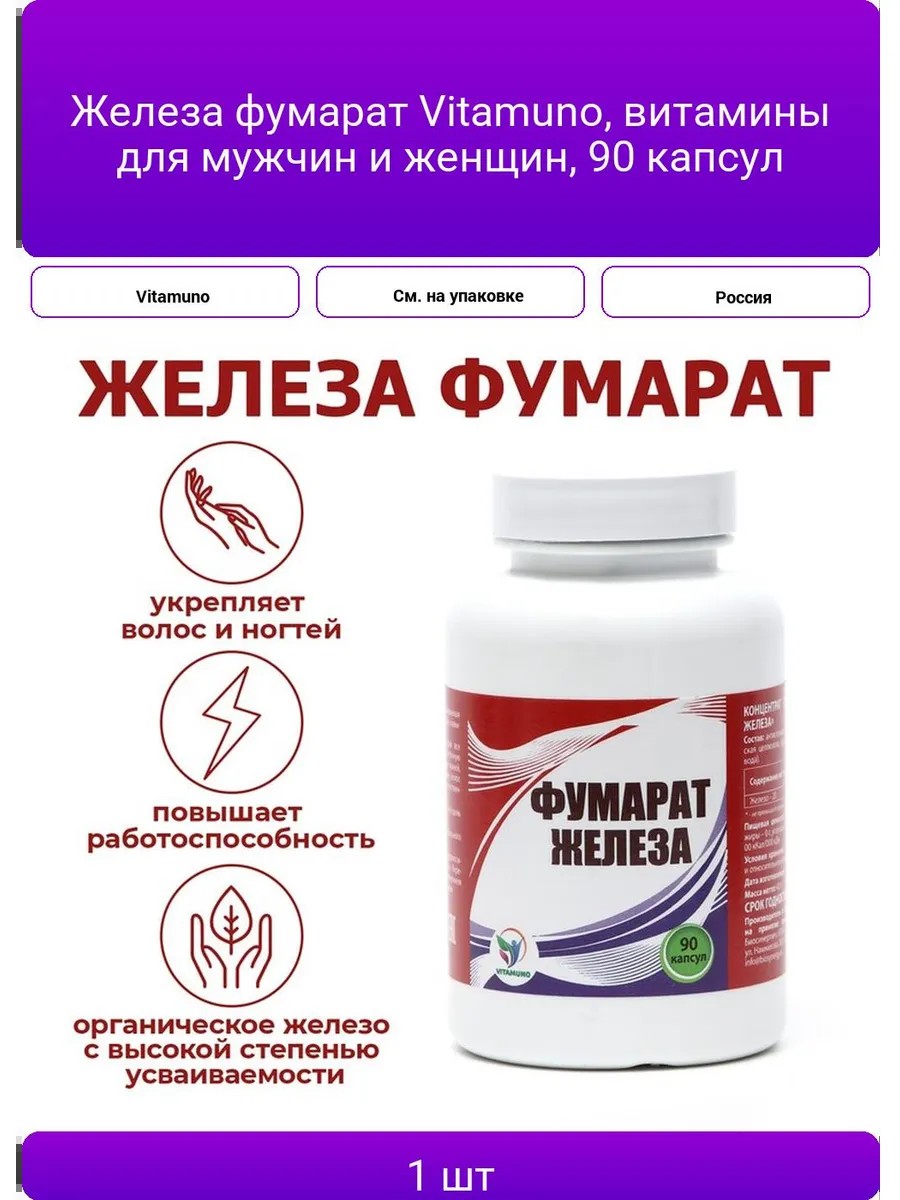 Железа фумарат Vitamuno — это высококачественные витамины, предназначенные для поддержания здоровья кожи, волос и ногтей. Идеально подходят как для мужчин, так и для женщин, они помогут укрепить волосы и ногти, а также справиться с проблемами выпадения волос и низкой работоспособности. Упаковка содержит 90 капсул, что обеспечивает длительный курс приема. Эти витамины — отличный выбор для тех, кто заботится о своем здоровье и внешнем виде.