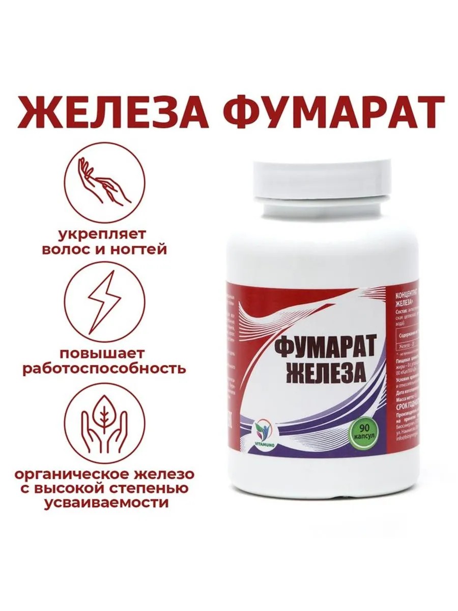 Ferrous fumarate is an organic source of iron with a high degree of absorption, without a characteristic iron taste. Iron is an essential component for the synthesis of hemoglobin and myoglobin. It promotes the transfer of oxygen to organs and tissues and the removal of carbon dioxide from the body. Participates in oxidation-reduction reactions of the body, stimulates the synthesis of red blood cells. Iron is an essential component for the proper functioning of the immune system. Ferrous fumarate compensates for natural iron losses in men and women. Iron deficiency in the body leads to the development of iron deficiency conditions (anemia): • decreased performance. • fatigue. • weakness. • dizziness. • hair loss. • brittle nails. • pale skin. Taking iron fumarate will help: • replenish natural iron losses, incl. during menstruation and sports;• prevention of iron deficiency anemia and its negative manifestations;• increasing endurance and performance, improving athletic performance;• improving brain function.Dosage and administration:Recommended use: adults take 1 capsule daily with meals.Duration of administration: 1 month. If necessary, the dose can be repeated.Indications:As a food supplement - an additional source of iron.Composition:Anti-caking agent microcrystalline cellulose, capsule (gelatin, water), iron fumarate.Contraindications:Individual intolerance to the components, pregnancy, breastfeeding.Special instructions:Not a medicine or dietary supplement.It is recommended to consult a doctor before use.