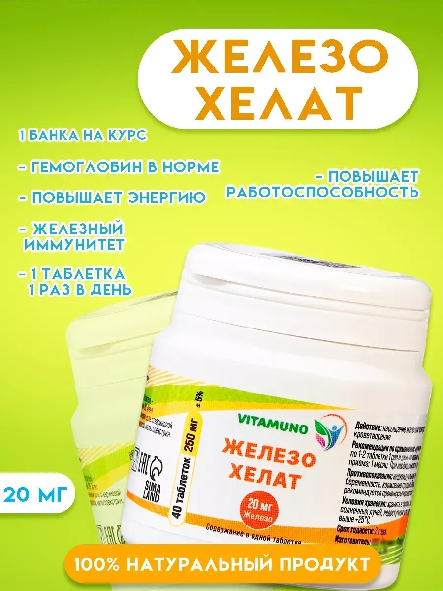 Железо хелат Vitamuno – это биологически активная добавка (БАД) к пище, легкодоступный хелатный комплекс для максимального усвоения железа. Железо хелат содержит высокую дозировку железа. Железо хелат Vitamuno способствует поддержанию в норме уровня ферритина и гемоглобина, снижению риска развития анемии, снижению усталости, повышению работоспособности. Хорошо усваивается без побочных эффектов со стороны ЖКТ (не вызывает вздутия, запоров и диареи), так как не влияет на уровень кислотности желудка. Способ применения и дозы: Мужчинам по 1 таблетке, женщинам по 1-2 таблетки 1 раз в день во время еды. Продолжительность приема: 1 месяц. При необходимости прием можно повторить. Показания: В качестве биологически активной добавки к пище - дополнительного источника железа. Биодоступное легкоусвояемое железо, способствует поддержанию в норме уровня ферритина и гемоглобина, снижению риска развития анемии, снижению усталости, повышению работоспособности, хорошей переносимости без побочных эффектов со стороны желудочно-кишечного тракта. Противопоказания: Индивидуальная непереносимость компонентов. Перед применением рекомендуется проконсультироваться с врачом. Особые указания: Не является лекарственным средством. Перед применением рекомендуется проконсультироваться с врачом.