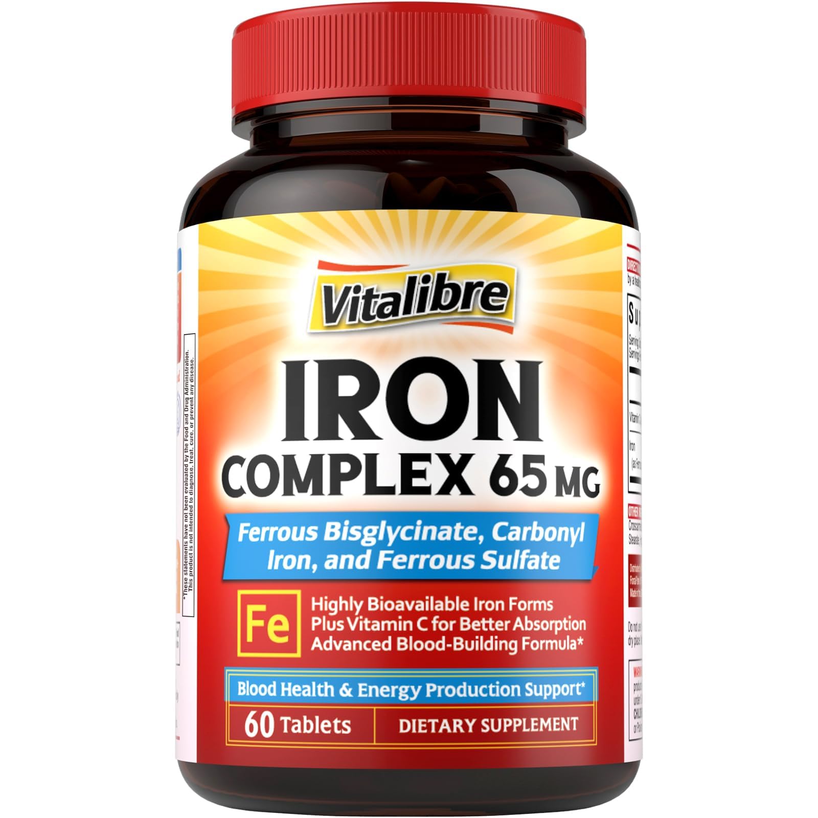 High Quality And Value: From meticulously sourcing the finest, most bioavailable ingredients to rigorously testing each formula, the team behind Vitalibre is driven by a relentless pursuit of purity and potency. Putting aside unnecessary fillers and artificial ingredients, we're committed to transparency in labeling and providing clear information contains zero sugar, gluten, dairy, soy, wheat, eggs, tree nuts peanuts. Made With You In Mind: Combining nature's nutrients with carefully crafted formulas, we create our first line of clean supplements to help you make confident choices for your health. We are proud to affirm all Vitalibre products are manufactured in the U.S in facilities that adhere to strict Good Manufacturing Practices (GMP) guidelines. Perfect for Active Lifestyles, Busy Schedules, and More: Stay energized, focused, and active throughout the day, no matter what your routine looks like. Whether you're a busy professional, a woman of childbearing age, or someone simply dealing with fatigue, Vitalibre Iron Conplex is designed to help keep your iron levels in check. It's ideal for individuals who experience low iron levels and need a natural energy boost. . Vitamin C to Supercharge Your Iron Absorption: Each tablet contains 50mg of natural Vitamin C, which works in synergy with iron to enhance absorption. This powerful combination ensures that your body gets the most out of every dose, helping to reduce fatigue and maintain steady energy levels throughout the day. . Triple Iron Power for Optimal Support : Say goodbye to sluggishness with 65mg of elemental iron from a smart blend of 3 forms of iron - ferrous bisglycinate for gentle absorption, carbonyl iron for steady release, and ferrous sulfate for proven performance. Together, they give you a complete iron solution, promote blood building, boost energy, and fight fatigue while minimizing discomfort. .