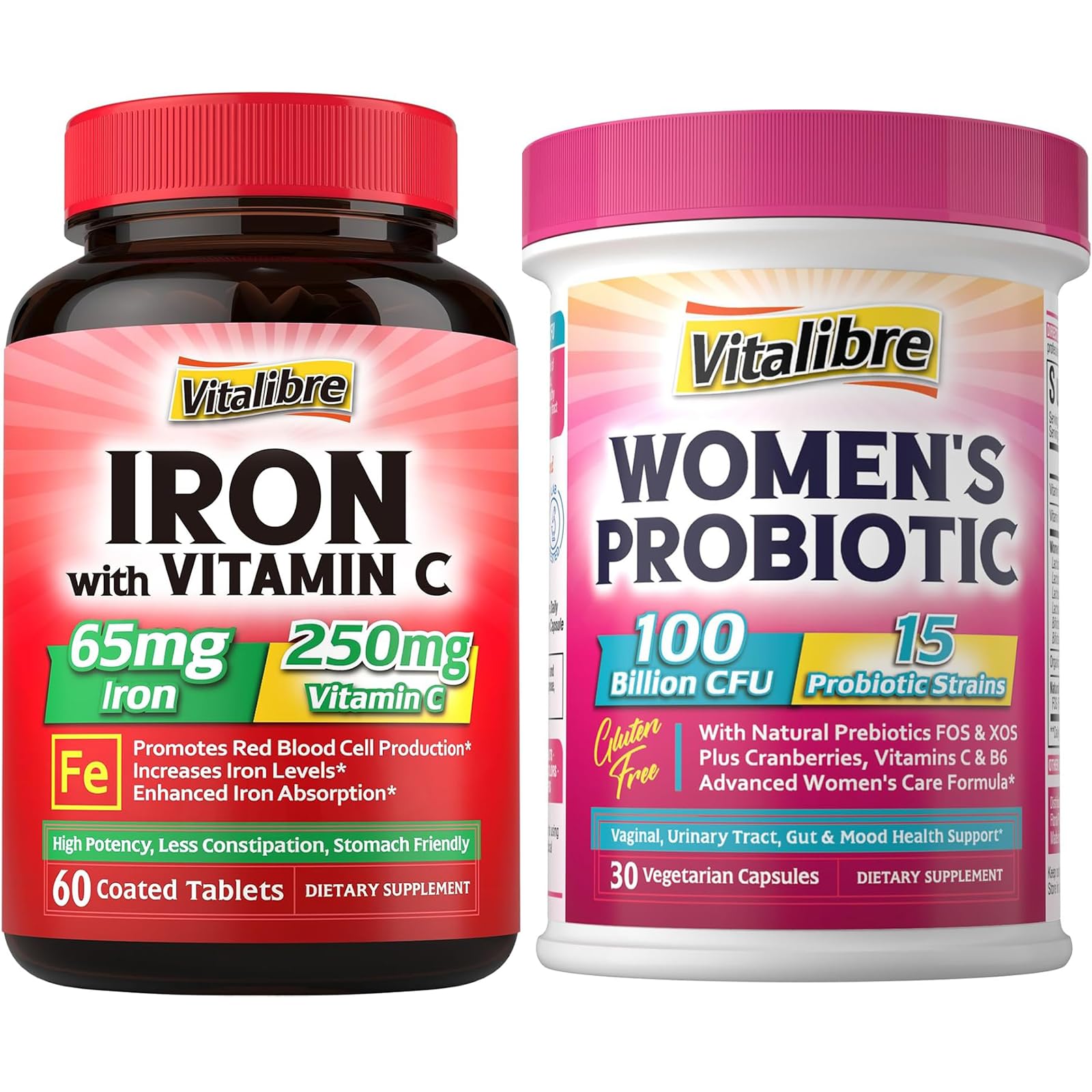 Iron Supplement, 65mg Carbonyl Iron with 250mg Vitamin C, Stomach Friendly Iron Pills for Blood Building Women Men, High Absorption, No Nausea, No Constipation, Non-GMO, No Gluten, 60 Vegan Tabs Vitalibre Women's Probiotics 100 Billion CFU, 15 Strains, w Prebiotic, Cranberry, Vitamin B6 VC, Gut, Vaginal Mood Health, Shelf Stable, 30 Vegan CapsulesMade With You In Mind: Combining nature's nutrients with science-backed formulas, we create our first line of clean supplements to help you make confident choices for your health. We are proud to affirm all Vitalibre products are manufactured in the U.S in facilities that adhere to strict Good Manufacturing Practices (GMP) guidelines. Digestive, Immune and Hormone Support : Our women's probiotics keeps every feminine health aspects in check. Probiotics work with prebioics to diversity and repopulate your gut and vaginal flora and relieve occasional digestive discomforts. Organic cranberry extract and vitamin C help strengthen immune function and shield the urinary tract from worst offender. Specially-added bioavailable vitamin B6 keeps hormone balanced during period and menopause. . Advanced 5-in1 Women's Probiotics: We've included 100 Billion CFU of 15 diverse probiotic strains with organic food-based prebiotics, women-friendly cranberry extract, immune-boosting vitamin C and specially-added bioavailable vitamin B6 (P5P). This advanced 5-in1 probiotics for women is carefully designed to target women's unique health needs. . Easy to Swallow Gentle on the Stomach: Carbonyl Iron has superior bioavailability and gentle absorption. Substantially less carbonyl iron is required to achieve the same daily intake levels compared with ferrous salts (e.g., ferrous sulfate, ferrous fumarate or ferrous gluconate), resulting in lower tablet weight and fewer unwanted digestive issues like nausea, upset tummy, or constipation. . Ideal For Individuals With Iron Deficiency : Our high-potency iron supplement is specially formulated for individuals suffering from low iron levels. One small coated tablet contains 65 mg of elemental iron, providing you with 361 of the Daily Value, along with 250 mg of vitamin C to enhance iron absorption while also providing additional immune support and antioxidant benefits. .
