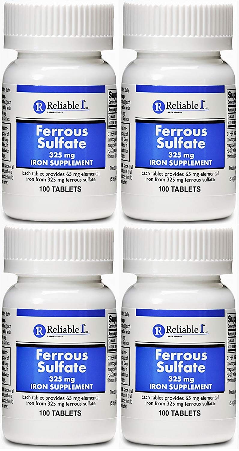Iron Supplement Ferrous Sulfate 325mg by Reliable 1 | Iron Pills for Women and Men | Iron Supplements for Anemia and Iron Deficiency | 100 Iron Tablets per Bottle Pack of 4