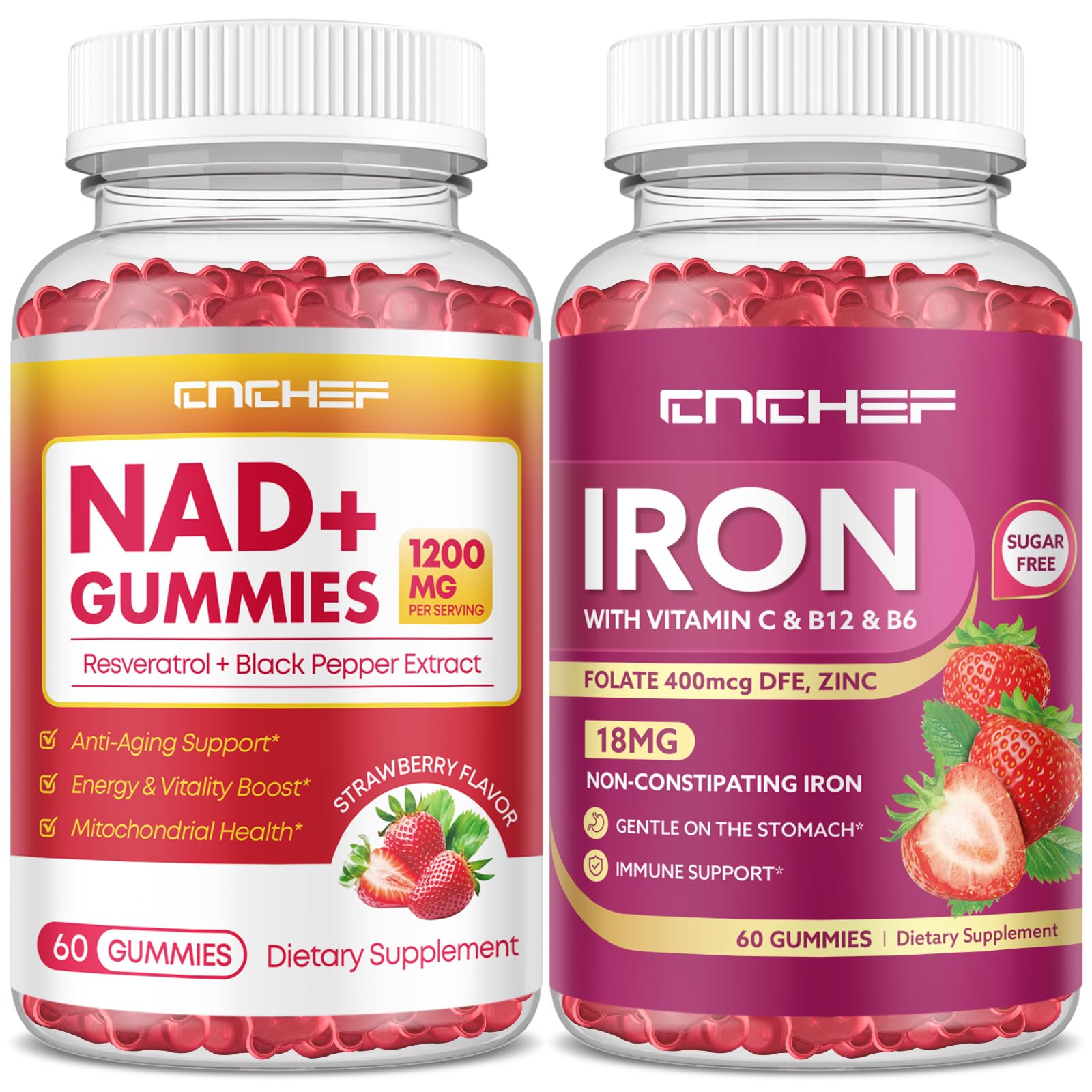 Iron Supplement for Women Men Gummies NAD GummiesCellular Energy, Sleep Longevity Formula: Each gummy contains 1200 mg NAD , 300 mg trans-resveratrol, and 10 mg black pepper extract. NAD is essential for cellular health, while trans-resveratrol helps maintain mitochondrial function. This synergistic formula helps maintain mitochondrial health, improve mental clarity, stabilize mood, promote restorative sleep, and activate anti-aging pathways. Why You Need NAD Supplements?: CNCHEF NAD Gummies for women men supports your ability to stay healthy by boosting NAD levels, which naturally diminish with age. NAD plays a crucial role in cellular function and repair, bolstering brain, heart muscle health , cellular energy production, repair processes, and effective management of lifestyle stress. KID-APPROVED BEAR GUMMIES WITH SUGAR-FREE JOY: Cheerful bear-shaped gummies burst with natural strawberry flavor, sweetened guilt-free with xylitol (no added sugars). Pectin-based, vegan-friendly formula is gentle on tiny tummies and perfect for picky eaters. No artificial colors, gluten, dairy, or GMOs—parents can trust these tasty treats to support growing bones, brain development, and active lifestyles. SMART NUTRIENT FUSION FOR IMMUNITY VITALITY: Enriched with 6 essential nutrients: Vitamin B12 (250 DV) and B6 to fuel red blood cell production, Folate (400mcg DFE) for DNA health, Zinc (9mg, 60 DV) to strengthen immune defense, plus antioxidant-rich Vitamin C. This science-backed blend enhances focus in kids, sustains energy for busy adults, and promotes overall wellness across all life stages. ADVANCED IRON ABSORPTION DAILY ENERGY BOOST: CNCHEF Iron Gummies feature highly bioavailable Ferrous Bisglycinate Chelate (18mg per serving, 100 DV) paired with 90mg Vitamin C to maximize iron uptake and oxygen transport. Gently supports healthy hemoglobin levels without stomach discomfort, constipation, or metallic aftertaste. Ideal for combating fatigue in children, menstruating women, pregnant nursing moms, athletes, and vegetarians seeking a fuss-free iron supplement.