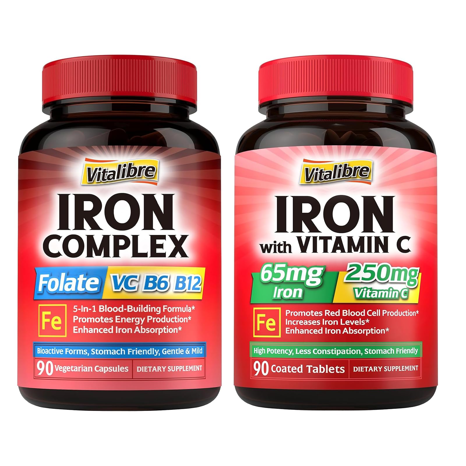 Iron Supplement for Women Men, with Vitamins C, B6, B12 Folate for Iron Deficiency, Blood Building Energy Support, Stomach Friendly, Better Absorption, Non-GMO, No Gluten, 90 Vegan Caps Iron Supplement 65mg with Vitamin C, Stomach Friendly Carbonyl Iron, High Absorption, Once Daily, Supports Red Blood Cell Production, Gluten Free, Non-GMO, 90 TabletsMADE IN THE USA: Combining nature's nutrients with science-backed formulas, we create our first line of clean supplements to help you make confident choices for your health. We are proud to affirm all Vitalibre products are manufactured in the U.S in facilities that adhere to strict Good Manufacturing Practices (GMP) guidelines. Ideal For Individuals With Iron Deficiency : Our high-potency iron supplement is specially formulated for individuals suffering from low iron levels. One small coated tablet contains 65 mg of elemental iron, providing you with 361 of the Daily Value, along with 250 mg of vitamin C to enhance iron absorption while also providing additional immune support and antioxidant benefits. . Boost Energy Immune Health : By supporting healthy red blood cells, Vitalibre vegan iron supplement helps boost oxygen transportation, bringing you long-lasting energy, robust immune system, better muscle function, and enhanced workout performance. Loaded with essential B vitamins and natural vitamin C, this Iron Complex also helps support the conversion of food into energy and promote antioxidant capacity. . 5-IN-1 Blood-Building Formula : Our gentle iron pills provide the most natural and bioactive forms of blood vitamins including 667 mcg folate (as L-5-MTHF), 30 mcg of methyl B12, and 5 mg of bioactive B6 (P-5-P), the vital nutrients required for hemoglobin formation and red blood cell production, along with 30 mg of natural vitamin C to enhance iron absorption. . Non-Constipating Iron Bisglycinate: Vitalibre Iron Complex provides 36 mg of elemental iron in a gentle, well-absorbed form as iron bisglycinate (ferrous bisglycinate), which boosts your iron levels without unwanted digestive issues like nausea or constipation. This iron supplement is great for individuals with increased iron needs, such as menstruating women, pregnant women, vegans, vegetarians, athletes recent blood donors. .