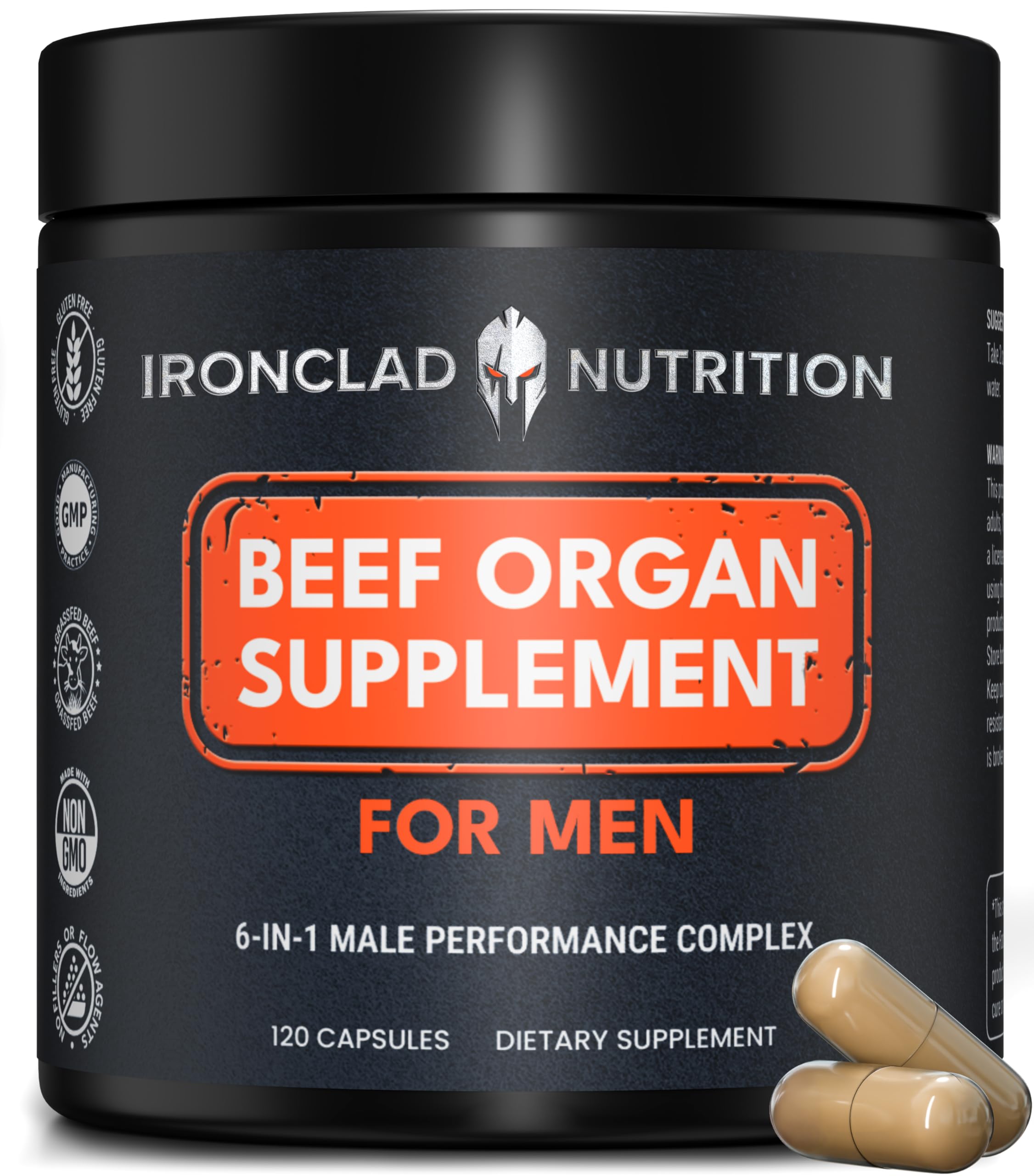 Ironclad Nutrition Beef Organ Supplement for Men - 100% Grass Fed Gluten-Free Bull Complex for Men s Health - Freeze Dried Ancestral Bovine Superfoods for Vital Energy, Immunity Support - 120 Capsules
