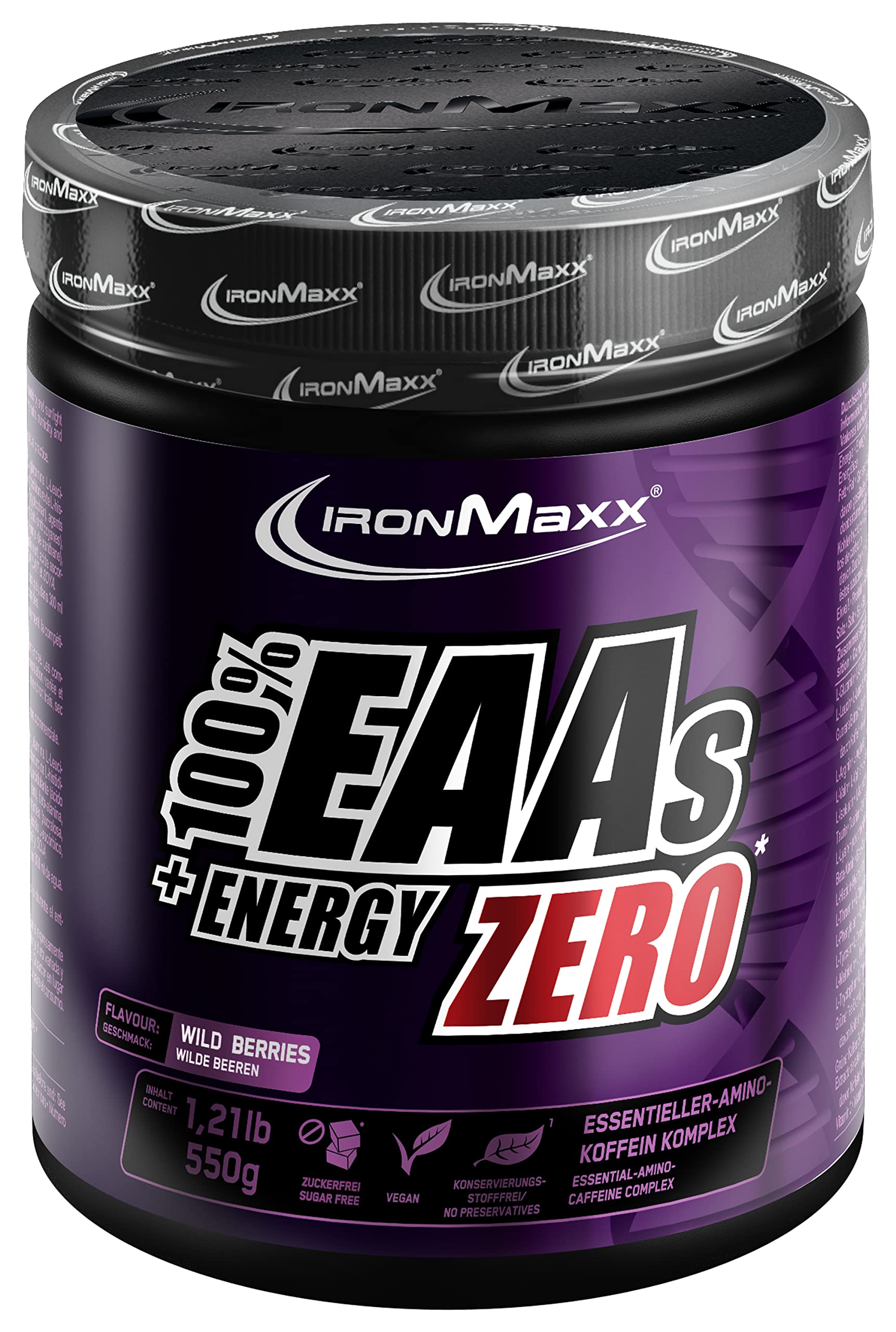 The EAA powder from Ironmaxx contains high-quality essential amino acids with the additional energy boost made of caffeine, green tea extract, guarana and vitamin C. In addition, the EAAS L-arginine, beta-alanine and L-glutamine in a balanced recipe for ideal workout.The ideal protein shake alternative made of high-quality essential amino acids with caffeine and vitamin C. Ingredients ingredients Aminosic acid mixture (L-Glutamine, L-Leucin, L-Arginine, L-Valin, L-Isoleucin, L-Lysinhydrochloride, L-Histidinhydrochloride, L-Threonin, L-Phenylalanin, L-Tyrosin, L-Methionin, L-Typtophan), Acidic agent (citronic acid), guarana extract, taurine, aroma, dye (anthocyan), beta-alanine, beetroot extract, thickener (xanthan), sweetener (sucralose, stevioglycoside), green tea extract, green coffee extract,Ascorbic acid (vitamin C), inulin. Instructions Put 10g powder (1 heaped tablespoon) and 300ml of cold water in the mixer cup and shake heavily for 20 seconds.Take a portion before or during training, betting kamps or physical stress. Warnings The specified daily consumption of consumption must not be exceeded!Do not use as a replacement for a balanced and varied diet!Keep out of reach of small children!Store protected from heat, moisture and sunlight.Contains caffeine!Not recommended for children and pregnant women. Address manufacturer importer Ironmaxx Nutrition GmbH Co. KG, Wegelinstr.15, 50354 Hürth, Germany Moredelivery: 1 x 500 g Ironmaxx 100 EAAS Energy Zero Wild Berries Pure EAA-Amino acid powder.Slightly soluble and perfect in taste: Simply dissolve the EAAS powder in water and shake about 20 seconds - the fruity taste compensates for all effort during training.Thanks to the sugar -free recipe, unnecessary calories are avoided the powder gets the maximum out of everyone, in combination with hard training.Short -ranged amino acid ensure a quick absorption - the pure EAAS powder can be taken for direct effects directly, during or shortly after training.Run to the best form: All 8 essential plus the semi-essential amino acid Histidin and all 3 BCAAs.Das EAA-Pulver von IronMaxx enthält hochwertige essentielle Aminosäuren mit dem zusätzlichen Energie-Boost aus Koffein, Grüntee-Extrakt, Guarana und Vitamin C. Zusätzlich enthalten die EAAs L-Arginin, Beta-Alanin und L-Glutamin in ausgewogener Rezeptur für das ideale Workout. Die ideale Proteinshake-Alternative aus hochwertigen essentiellen Aminosäuren mit Koffein und Vitamin C. INHALTSSTOFFE ZUTATEN Aminosäuremischung (L-Glutamin, L-Leucin, L-Arginin, L-Valin, L-Isoleucin, L-Lysinhydrochlorid, L-Histidinhydrochlorid, L-Threonin, L-Phenylalanin, L-Tyrosin, L-Methionin, L-Tryptophan), Säuerungsmittel (Citronensäure), Guarana-Extrakt, Taurin, Aroma, Farbstoff (Anthocyan), Beta-Alanin, Rote Beete Extrakt, Verdickungsmittel (Xanthan), Süßungsmittel (Sucralose, Stevioglycoside), Grüntee-Extrakt, Grüner Kaffee-Extrakt, L-Ascorbinsäure (Vitamin C), Inulin. GEBRAUCHSANWEISUNG 10g Pulver (1 gehäufter Esslöffel) und 300ml kaltes Wasser in den Mixbecher geben und 20 Sekunden lang stark schütteln. Nehmen Sie eine Portion vor oder während des Trainings, Wettkamps oder körperlicher Belastung ein. WARNHINWEISE Die angegebene tägliche Verzehrmenge darf nicht überschritten werden! Nicht als Ersatz für eine ausgewogene und abwechslungsreiche Ernährung verwenden! Außerhalb der Reichweite von kleinen Kindern lagern! Vor Wärme, Feuchtigkeit und Sonneneinstrahlung geschützt aufbewahren. Enthält Koffein! Für Kinder und schwangere Frauen nicht empfohlen. ANSCHRIFT HERSTELLER IMPORTEUR IronMaxx Nutrition GmbH Co. KG, Wegelinstr. 15, 50354 Hürth, Deutschland MehrLieferumfang: 1 x 500 g IronMaxx 100 EAAs Energy Zero Wild Berries Reines EAA-Aminosäuren-Pulver. Leicht löslich und perfekt im Geschmack: Das EAAs Pulver einfach in Wasser auflösen und ca. 20 Sekunden schütteln - der fruchtige Geschmack entschädigt alle Anstrengung beim Training. Dank zuckerfreier Rezeptur werden unnötige Kalorien vermieden Das Pulver holt, in Kombination mit hartem Training, das Maximum aus jedem heraus. Kurzverkettete Aminosäure sorgen für eine schnelle Resorption - so kann das reine EAAs Pulver direkt vor, während oder kurz nach dem Training eingenommen werden für direkte Wirkung. Zur Bestform auflaufen: Alle 8 essentiellen plus die semi-essentielle Aminosäure Histidin und alle 3 BCAAs.IronMaxx 100 EAAs Energy Zero - Wild Berries 500g Dose EAA-Pulver, vegan und zuckerfrei mit allen 8 essentiellen Aminosäuren fruchtiger Geschmack, frei von Konservierungsstoffen Wilde Beeren