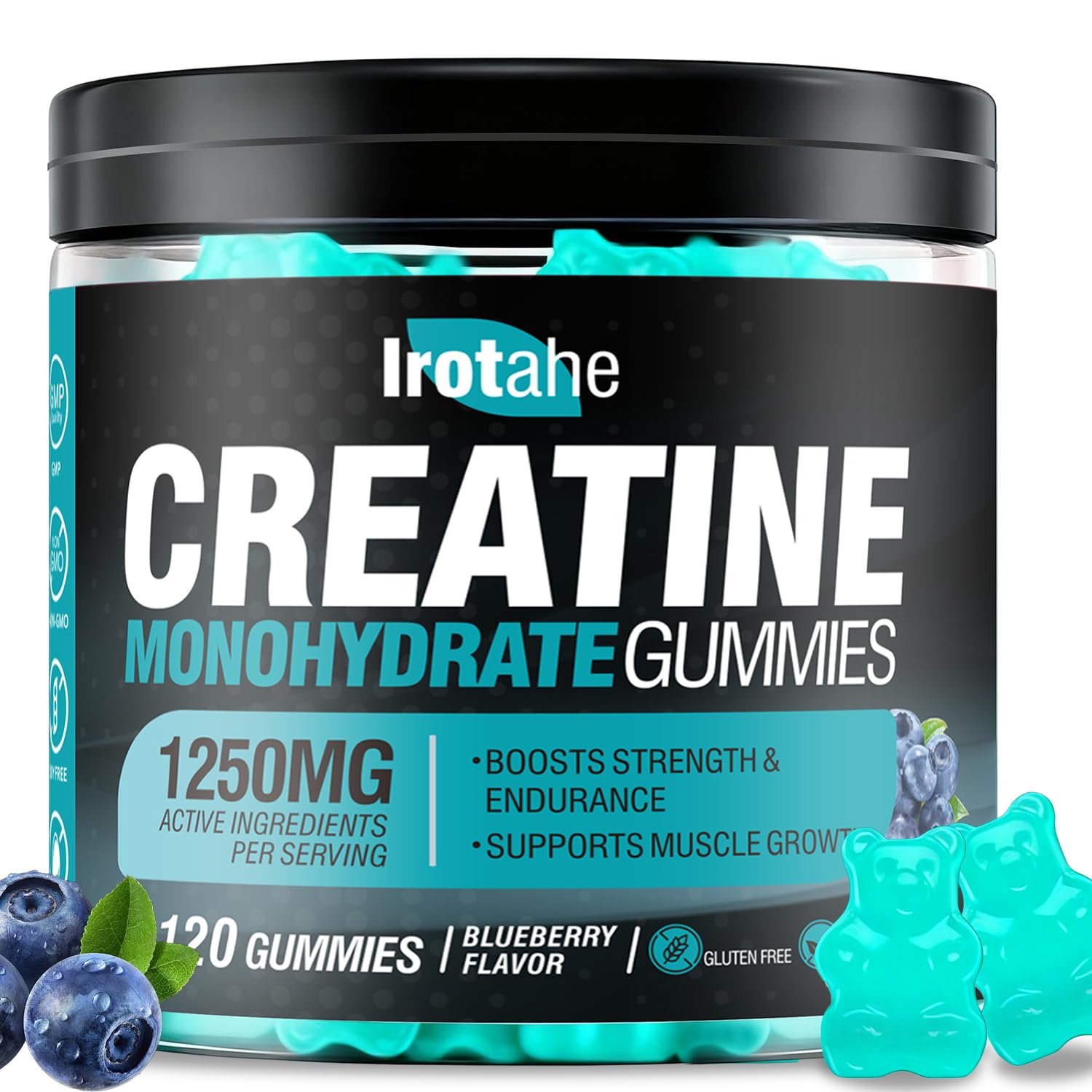 Irotahe Creatine Monohydrate Gummies 1250mg per Serving Pure Creatine for Men & Women Max Strength Pre Workout Post Workout Supplement Supports Muscle Growth Energy Recovery- 120 Count (Blueberry)