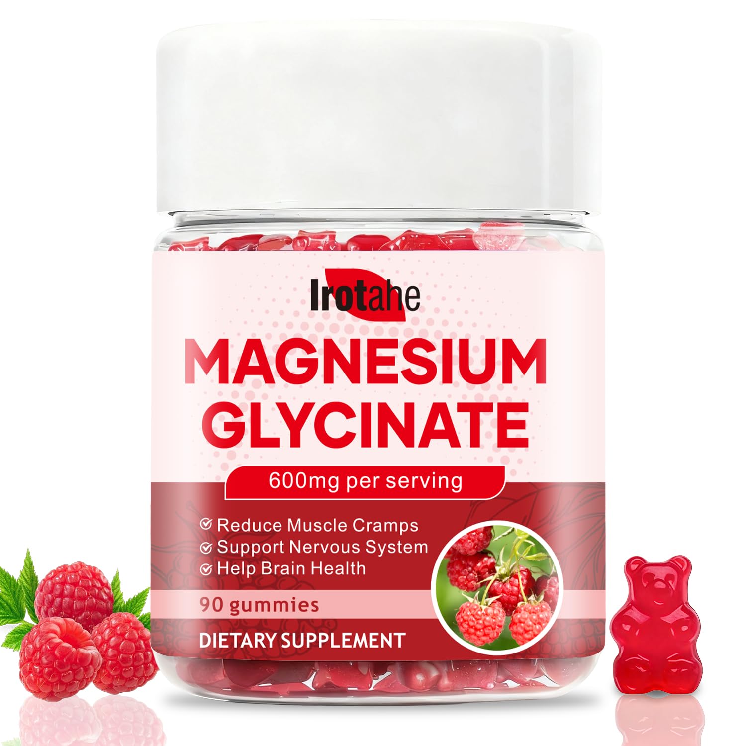 Irotahe Magnesium Glycinate Gummies 600mg - Sugar Free Raspberry Chews with L-Threonate Vitamin D3 & B6 - Supports Relaxation Sleep & Nervous System Health - 90 Gummies (Raspberry)