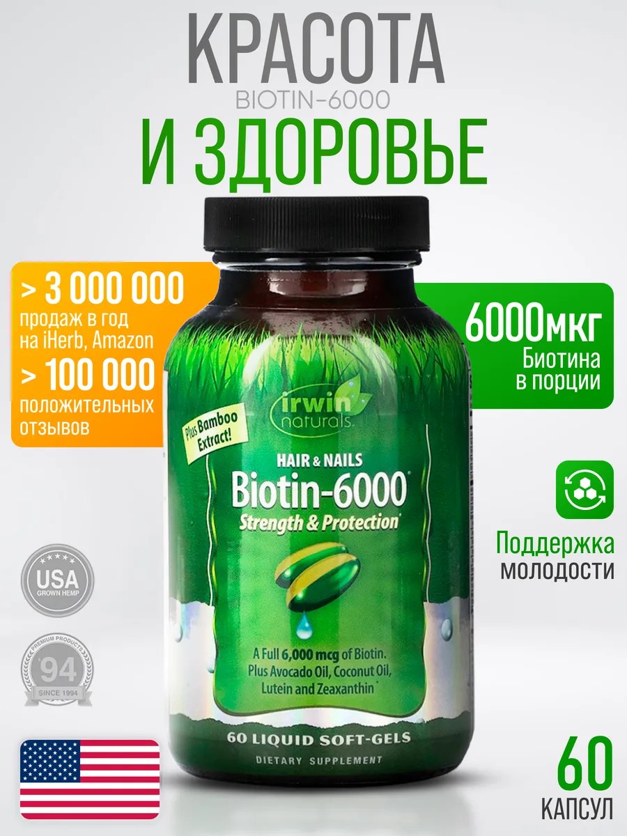 Получите красоту изнутри с Irwin Naturals Biotin-6000! Эта высокоэффективная формула, обогащенная биотином (витамином B7) и мощной смесью натуральных ингредиентов, поддерживает здоровье волос, кожи и ногтей. Биотин-6000 способствует укреплению сухих и ломких ногтей, улучшает увлажнение кожи и повышает эластичность. Он работает на клеточном уровне, помогая восстановить здоровье и сияние волос, защитить кожу от воздействия свободных радикалов и поддерживать здоровье ногтей.