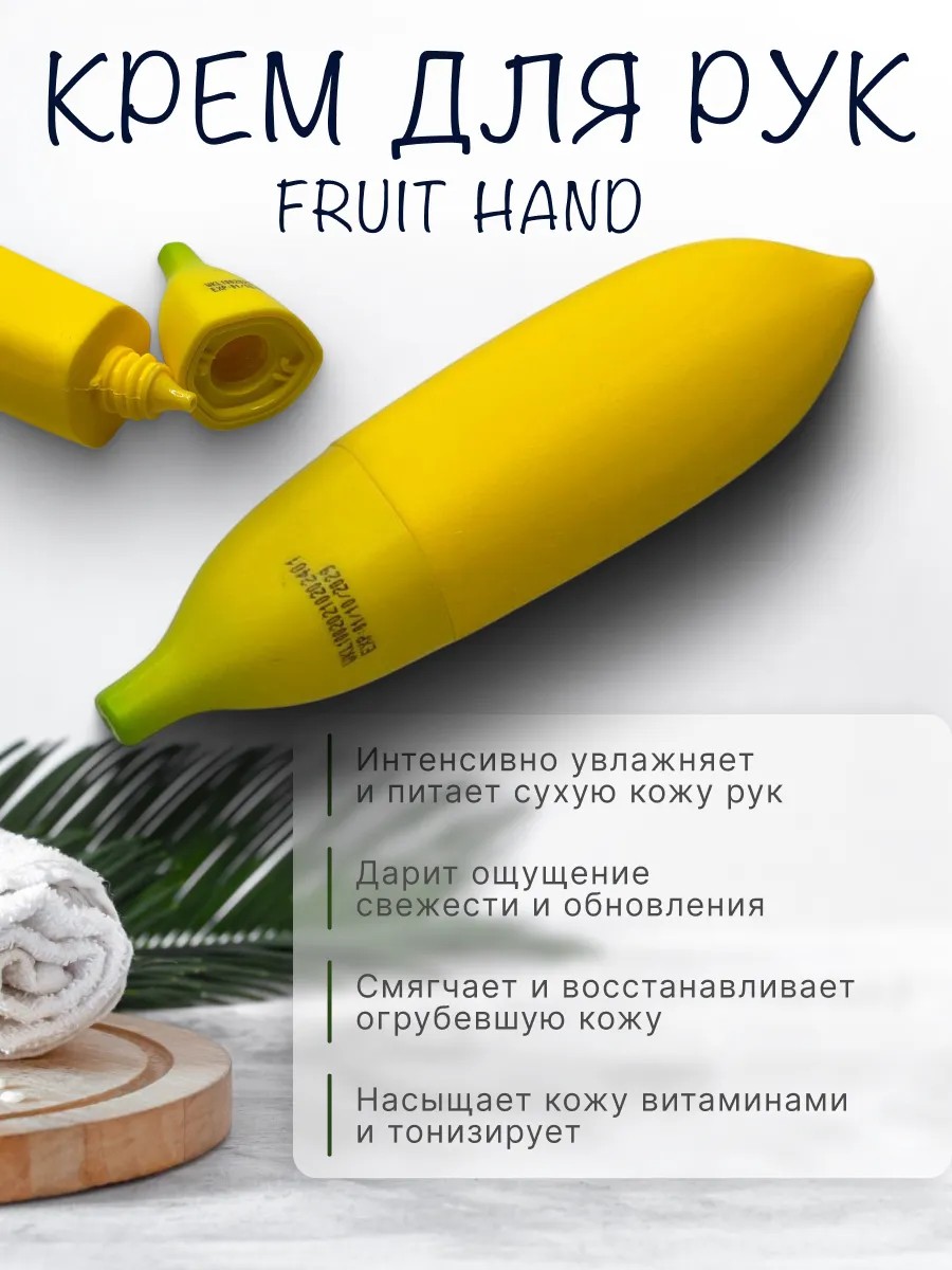 Крем для рук с экстрактом банана — это не только эффективное средство ухода, но и стильное дополнение к косметичке благодаря оригинальной упаковке в виде фрукта, Fruit Hand Cream увлажняет, смягчает и питает сухую и огрубевшую кожу рук, дарит коже ощущение свежести и обновления, насыщает витаминами и тонизирует. Его формула разработана для восстановления, питания и смягчения кожи, особенно в периоды, когда она наиболее уязвима — в холодное время года, при ветре, сухом воздухе или контакте с бытовой химией. Крем легко наносится, быстро впитывается и не оставляет ощущения липкости или жирной плёнки, обеспечивая комфорт с первых секунд использования.
