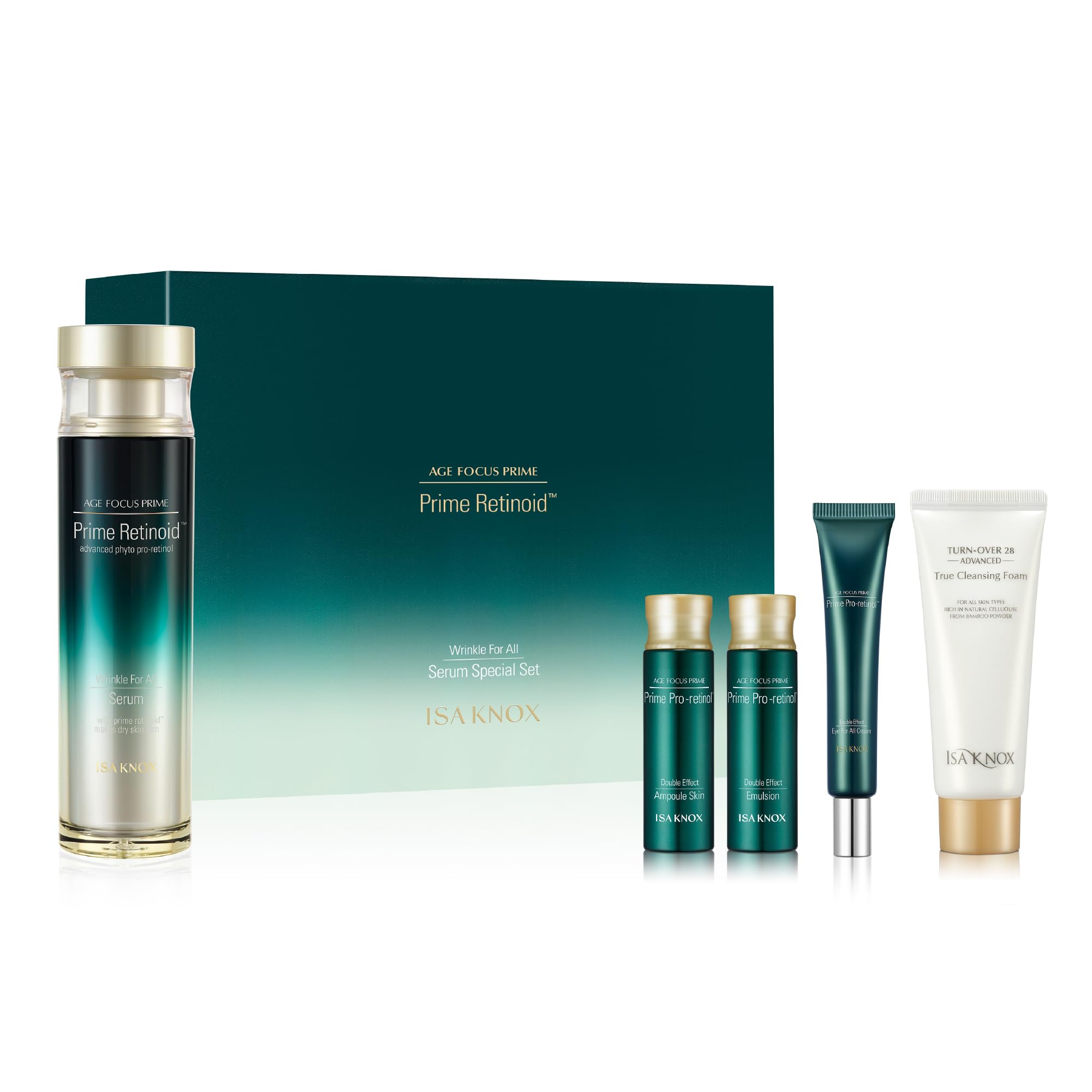 LG BEAUTY- Proudly a part of LG H H, bringing you effective skincare and products to elevate your life through patented ingredients and LG's forefront of science, technology, and expertise. ISA KNOX - Having made its launch in 1995, Isa Knox had a vision to revolutionize the skincare industry by providing proven solutions to the main skin concern for most women signs of aging. With that one ultimate goal in mind, Isa Knox started its Halve The Skin Age Project which then brought its first innovation, Wrinkle Decline, the first Korean cosmetics line with an aging solution. PLANT-BASED PREMIUM SKINCARE SOLUTION - Prime Pro-Retinol Phyto-DNA Ornithine - Containing mainly plant-based ingredients known to hydrate and rejuvenate the skin layers, Prime Pro-Retinol, built to tackle all signs of skin aging, this patented ingredient is a natural Retinol precursor making it safe to use twice a day, morning and night. PRIME HOLE TECHNOLOGY - Formulation backed by science, this highly absorbent formula encapsulates active ingredients in Squalane allowing deeper and better penetration into the skin to deliver firming, moisturizing, and illuminating benefits. ISA KNOX AGE FOCUS PRIME WRINKLE FOR ALL SERUM SPECIAL SET - Age Focus Prime Wrinkle For All Serum (50 ml 1.69 fl oz), Age Focus Prime Double Effect Ampoule Skin Toner (20 ml 0.68 fl oz), Age Focus Prime Double Effect Emulsion (20 ml 0.68 fl oz), Age Focus Prime Double Effect Eye For All Cream (15 ml 0.51 fl oz) Turnover28 AD True Cleansing Foam (40 ml 1.36 fl oz).