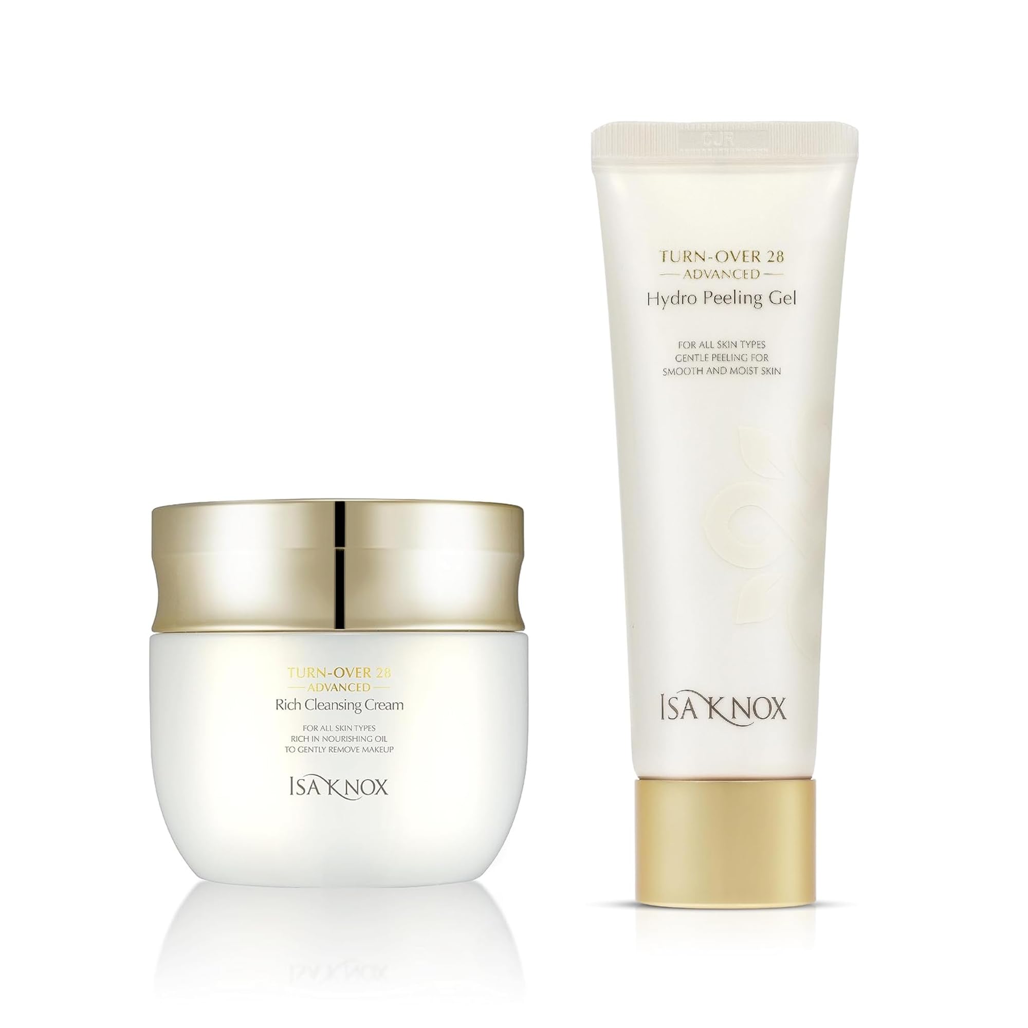 LG BEAUTY- Proudly a part of LG H H, bringing you effective skincare and products to elevate your life through patented ingredients and LG's forefront of science, technology, and expertise. DUAL ACTION - Experience the combined benefits of purifying and exfoliating with this unique hydro peeling gel. It helps to eliminate impurities while providing a moisturizing effect, resulting in a clearer and more refreshed complexion. CLEANSING MASSAGE IN ONE - Experience the benefits of a massage while effectively cleansing your skin. The rich, oil-infused formula allows for a soothing and gentle massage, enhancing the cleansing process and leaving your skin refreshed and revitalized. ISA KNOX TURNOVER 28 ADVANCED HYDRO PEELING GEL (120ml 4.1fl oz) - This product is specifically designed to support a healthy skin turnover cycle. Its gentle yet effective formula, enriched with natural moisturizing factors (NMF) and plant-derived cellulose, moisturizes and while gently exfoliating, leaving your skin revitalized. ISA KNOX TURNOVER 28 ADVANCED RICH CLEANSING CREAM is specifically designed to promote a 28-day turnover cycle, gently removing impurities and makeup while providing a nourishing and oil-enriched texture to prevent dryness.
