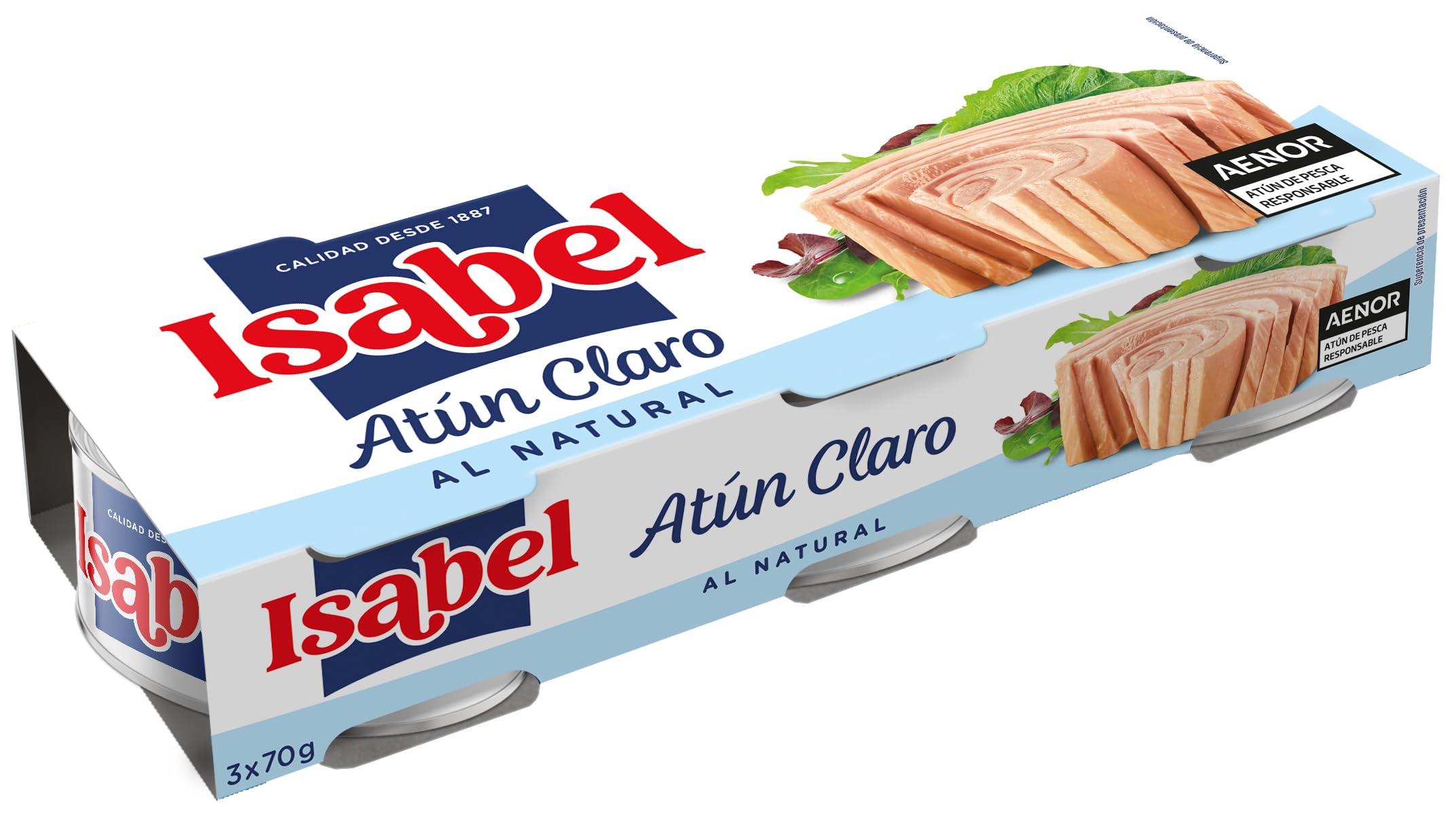 More flavor, just one drop of water. Our tuna has a HALAL guarantee. Transparency in the origin of all our tuna Discover the origins from the sea to your table via our traceability page More information in our packaging. Packaging with 100 recycled paper to protect our forests and contribute to sustainability. Tuna certified by AENOR under the APR seal (Responsible Fishing) – we use responsible fishing practices that care for the oceans and their resources and guarantee the best conditions for the fishermen of our fleet. Ingredients: light tuna (85 ), water, salt and natural flavoring of APIO and onions.Isabel Supernatuurlijke tonijn, verpakking van 3 x 56 gMeer smaak, slechts één druppel water. Onze tonijn heeft een HALAL-garantie. Transparantie bij de herkomst van al onze tonijn Ontdek de oorsprong van de zee tot aan uw tafel via onze traceerbaarheidspagina Meer informatie in onze verpakkingen. Verpakking met 100 gerecycled papier om onze bossen te beschermen en bij te dragen aan duurzaamheid. Door AENOR gecertificeerde tonijn onder het APR-zegel (verantwoorde visserij) – wij gebruiken verantwoorde visserijpraktijken die zich om de oceanen en hun hulpbronnen zorgen en de beste omstandigheden voor de vissers van onze vloot garanderen. Ingrediënten: lichte tonijn (85 ), water, zout en natuurlijk aroma van APIO en uien.