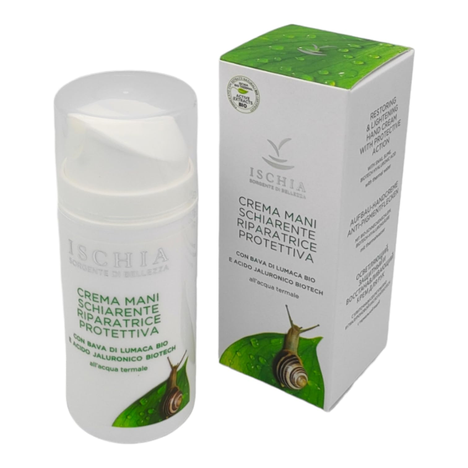 Designed to reduce and prevent skin spots caused by natural skin aging, nourishes moisture and protects the sensitive skin of the hands, repairs minor blemishes. It reduces and prevents skin spots caused by natural skin aging, nourishes moisture and protects the sensitive skin of the hands, repairs minor imperfections. INSTRUCTIONS FOR USE Distribute a small amount of the product over the hands and massage until completely absorbed.Nourishes and moisturizes, protects the sensitive skin of the hands and repairs minor imperfections. Lightens and prevents skin spots due to natural skin aging. Active ingredients: Thermal water, organic snail mucus, aloe, organic hyaluronic acid, biotech, avocado oil, organic sunflower oil, organic shea butter, almond oil, vitamin E, arbutin, organic calendula chamomile. Gives your hand a new freshness and a youthful, compact appearance. Clarifying, protective and repairing.ISB – lichtende beschermende handcrème, 100 ml, biologisch slakkenslijm, hyaluronzuur biotech op basis van thermisch water van de Ischia Ontworpen om huidvlekken te verminderen en te voorkomen die door de natuurlijke huidveroudering worden veroorzaakt, voedt vocht en beschermt de gevoelige huid van de handen, herstelt kleine oneffenheden. Het vermindert en voorkomt huidvlekken die door de natuurlijke huidveroudering worden veroorzaakt, voedt vocht en beschermt de gevoelige huid van de handen, herstelt kleine oneffenheden. GEBRUIKSAANWIJZING Een kleine hoeveelheid van het product over de handen verdelen en inmasseren tot het volledig opnemen.Verzorgt en hydrateert, beschermt de gevoelige huid van de handen en herstelt kleine onvolkomenheden. Verlicht en voorkomt huidvlekken door de natuurlijke huidveroudering. Werkzame stoffen: Thermisch water, biologische slakkenslijm, aloë, biologisch hyaluronzuur, biotech, avocado-olie, biologische zonnebloemolie, biologische kariet, amandelolie, vitamine E, arbutine, biologische calendula kamille. Geeft je hand een nieuwe frisheid en een jeugdige, compacte uitstraling. Verheldering, beschermend en reparerend.