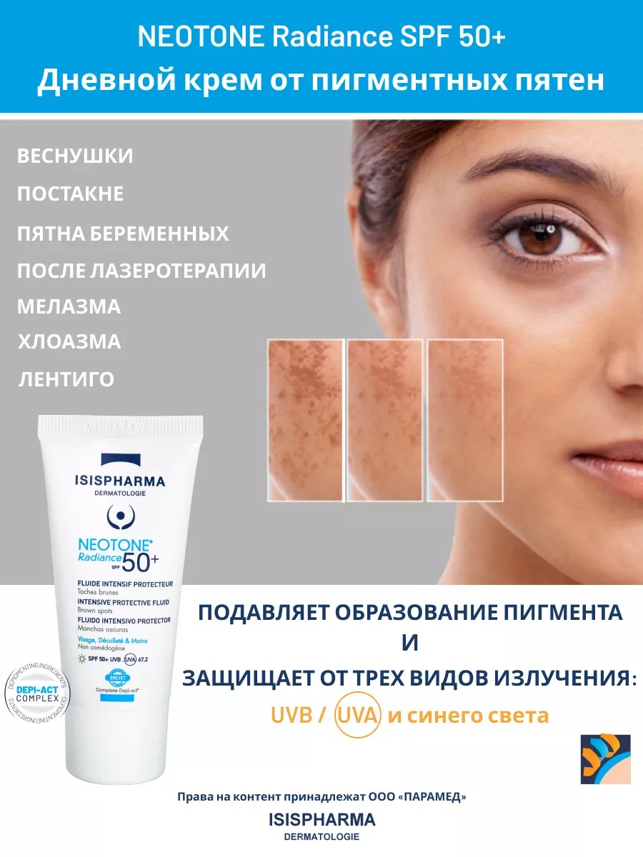 Для лучшего эффекта добавьте к дневному крему от солнца ночную сыворотку и средства для очищения и умывания из линии NEOTONE против пигментных пятен французской компании ИсисФарма. Эта лечебная косметика отличный подарок для женщин и мужчин, имеющих пигментные пятна на лице и на теле.
