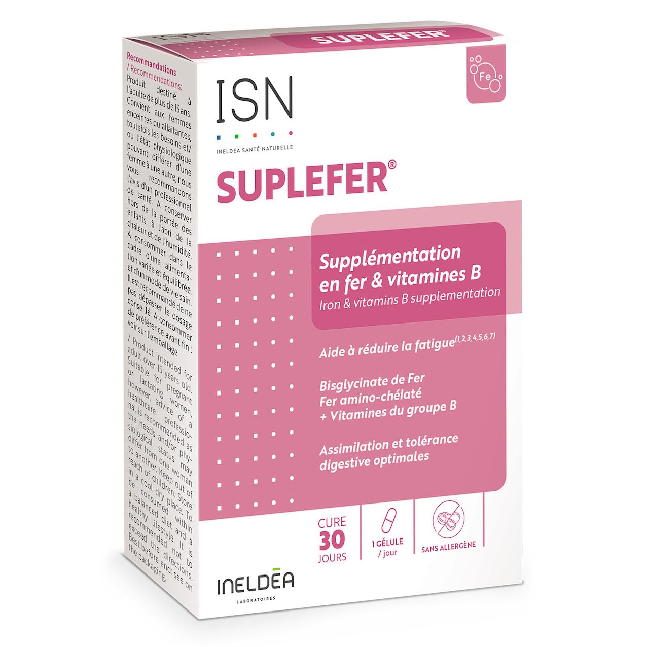 ISN is a brand specializing in dietary supplements focused on natural health. It offers a range of products designed to address various health needs, emphasizing high-quality natural ingredients. ISN is committed to providing effective solutions to improve consumers' well-being and quality of life, while adhering to the highest safety and quality standards. DIRECTIONS FOR USE: Take 1 Suplefer capsule daily, preferably in the morning or at midday with a meal, with a glass of water. INGREDIENTS: Bulking agent: microcrystalline cellulose vegetable capsule (HPMC, color: copper chlorophyllin complex), iron bisglycinate, anti-caking agent: talc vitamins B1-B2-B3-B5-B6-B8-B9-B12. No animal-derived ingredients - Allergen-free - Gluten-free. REDUCE FATIGUE: A course of Suplefer provides the body with iron and B vitamins, which help to revitalize the body and thus reduce feelings of fatigue. Vitamin B2 contributes to iron metabolism. IRON B VITAMINS: The Suplefer food supplement is a source of iron and vitamins B1, B2, B3, B5, B6, B8, B9, and B12. Each capsule provides 100 of the Reference Intakes (RI), thus helping to supplement dietary iron and B vitamin intake.ISN est une marque spécialisée dans les compléments alimentaires axés sur la santé naturelle. Elle propose une gamme de produits qui visent à répondre à divers besoins de santé, en mettant l'accent sur des ingrédients naturels de qualité. ISN s'engage à offrir des solutions efficaces pour améliorer le bien-être et la qualité de vie des consommateurs, tout en respectant les normes de sécurité et de qualité les plus élevées. CONSEILS D'UTILISATION : Prendre 1 gélule de Suplefer par jour, de préférence le matin ou le midi au moment des repas, avec un verre d'eau. COMPOSITION : Agent de charge : cellulose microcristalline gélule végétale (HPMC, colorant : complexe cuivrique des chlorophyllines), bisglycinate de fer, antiagglomérant : talc vitamines B1-B2-B3-B5- B6-B8-B9-B12. Sans ingrédients d'origine animale - Sans allergène - Sans gluten. RÉDUIRE LA FATIGUE : Une cure de Suplefer apporte à l'organisme du Fer et vitamines B qui contribuent à rebooster l'organisme et ainsi à atténuer les sensations de fatigue. La vitamine B2 participe au métabolisme du Fer. FER VITAMINES B : Le complément alimentaire Suplefer est source de Fer et vitamines B1-B2-B3-B5-B6-B8-B9-B12. Chaque gélule permet de couvrir 100 des AR, contribuant ainsi à compléter les apports en Fer et en vitamines B de l'alimentation.ISN - Suplefer - Aide à réduire la fatigue - Riche en Fer et Vitamines du groupe B - Fer microencapsulé plus biodisponible - Cure 30 jours