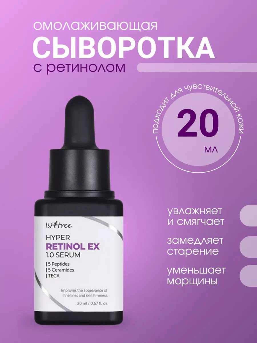 Активная разглаживающая сыворотка с ретинолом IsNtree Hyper Retinol EX 1.0 Serum направлена на интенсивную борьбу с мелкими мимическими морщинами и сокращает глубину выраженных. Способствует обновлению кожного покрова, выравнивает рельеф, улучшает цвет лица и замедляет процессы старения. Комплекс Retinol EX 1% стимулирует клеточную регенерацию, работает на уменьшение морщин в области межбровия, носогубных складок и на лбу. В составе комплекса Ретинол 0,1% оказывает антивозрастное действие, Ретинил пальмитат 0,3% эфир витамина A оказывает антиоксидантное действие, замедляет увядание кожи, Бакучиол 0,6% растительный аналог ретинола, стимулирует выработку естественного коллагена в клетках, борется с морщинами, повышает упругость и подавляет выработку меланина, отлично подходит для чувствительной кожи.