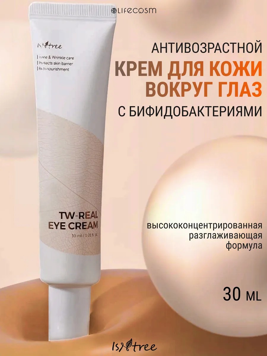Isntree TW-REAL EYE CREAM is a Korean eye cream designed specifically to address signs of aging and fatigue in this sensitive area. This eye cream features an intensive smoothing formula designed to reduce the appearance and prevent the appearance of wrinkles around the eyes. This rejuvenating eye cream contains unique ingredients whose combined action combats dark circles and bags under the eyes, puffiness, and signs of fatigue. This anti-aging cream deeply nourishes and strengthens the skin, providing intensive hydration and supporting its natural immune system. This anti-wrinkle eye cream also effectively evens out skin tone and strengthens the skin's protective barrier. This Bifidobacteria Cream contains 61% Bifidobacteria Lysate, which works primarily to maintain elasticity and firmness, as well as strengthen the skin around the eyes. This restorative eye cream also contains a valuable complex of natural shea butter and mango seed oil, which deeply nourish, restore, and smooth the skin, even out skin tone, help maintain softness, prevent moisture loss, and tone. With regular use, this firming eye cream provides a fresh look, flawless smoothness, and a natural glow. Isntree eye cream has a universal formula and is suitable for all skin types, especially those showing the first signs of aging. Directions: Apply a small amount of cream using gentle, circular motions to dry, cleansed skin around the eyes. You can purchase this anti-aging eye cream at Lifecosm, the original Korean cosmetics store.
