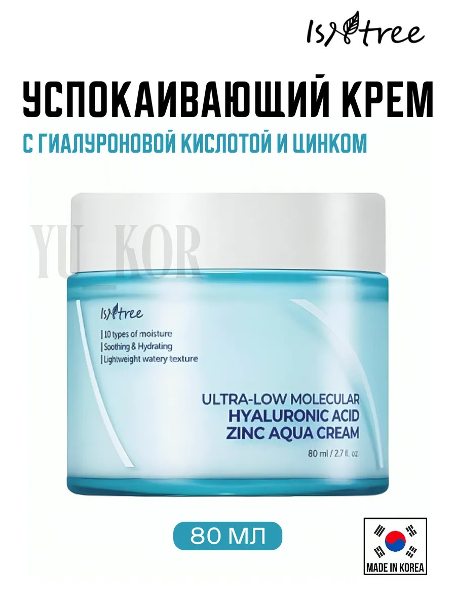 Увлажняющий крем IsNtree Ultra-low Molecular Hyaluronic Acid Zinc Aqua Cream способствует сужению пор, успокаивает раздражённую кожу и понижает её температуру до 6°C, снимает зуд и красноту. Восполняет недостаток влаги в клетках, защищает от обезвоженности и шелушения. Содержит 11 видов гиалуроновой кислоты, цинк, экстракт артишока, гамамелиса и чайного дерева.