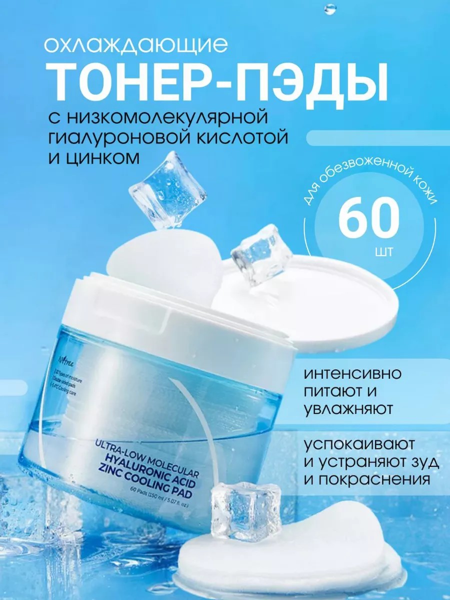 Охлаждающие тонер-пэды Isntree Ultra-Low Molecular Hyaluronic Acid Zinc Cooling Pad с низкомолекулярной гиалуроновой кислотой и цинком оказывают мгновенное успокаивающее действие и снижают температуру кожи на 5,4 С, устраняют зуд, покраснения и сокращают очаги воспалений и сужают расширенные поры. Интенсивно увлажняют и насыщают клетки необходимым количеством влаги, избавляя от обезвоженности, стянутости и шелушений. Регулируют работу сальных желёз в течение дня и нормализуют гидро-липидный баланс. Кроме того, они деликатно отшелушивают ороговевшие частички кожи.