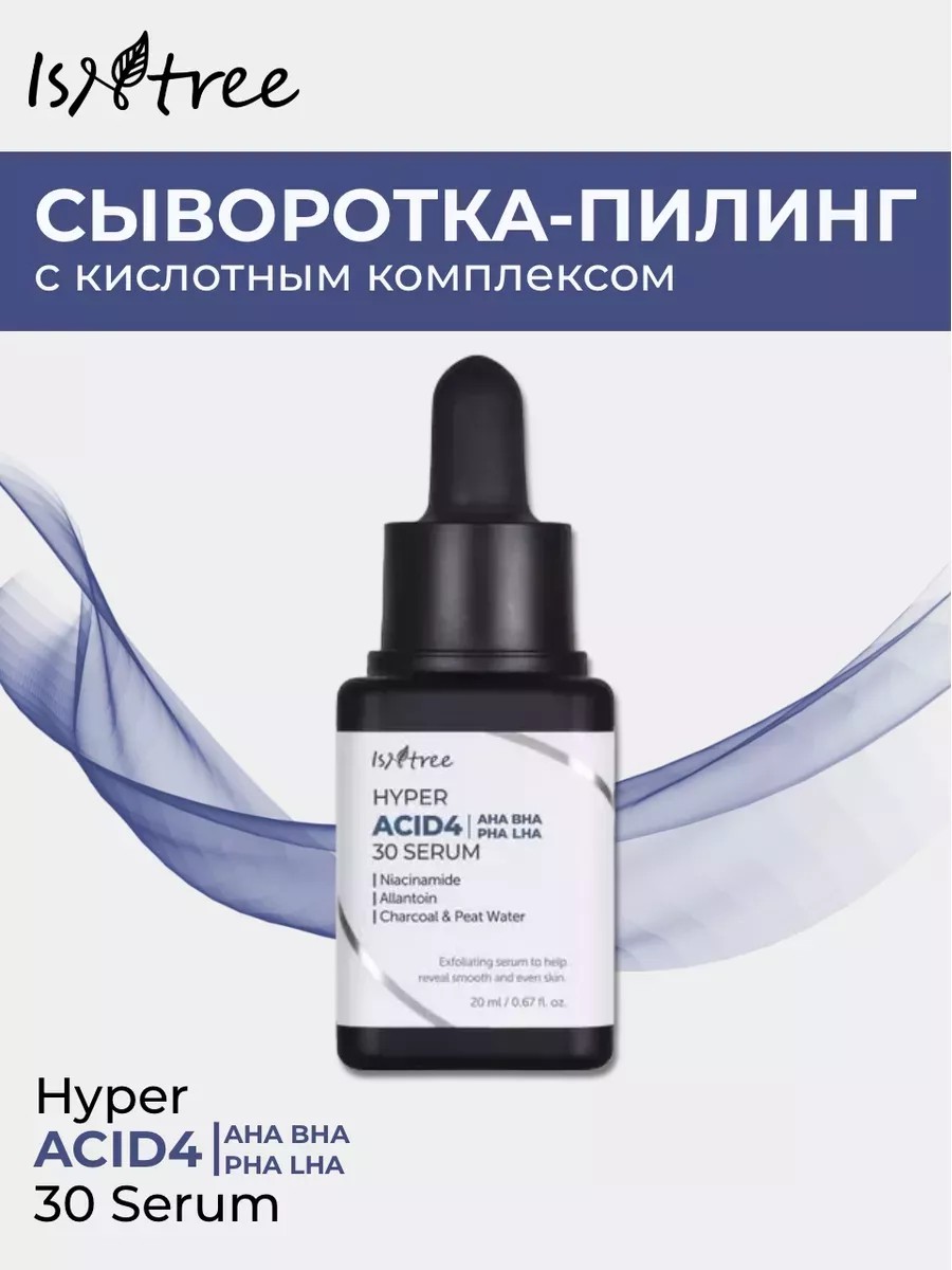 Высококонцентрированная пилинг-сыворотка Isntree Hyper ACID4 AHA BHA PHA LHA 30 Serum кислотным комплексом, ниациномидом и пудрой древесного угля это эффективный домашний пилинг, который борется с высыпаниями и чёрными точками, уменьшает жирность кожи и предотвращает появление блеска. Препятствует закупорке пор, стимулирует обновление клеток, нормализует секрецию сальных желёз. Продукт отшелушивает роговой слой, уменьшает видимость пигментации и следов от акне. Выравнивает микрорельеф, делает кожу чистой, гладкой и нежной. В основе формулы комплекс кислот AHA, BHA, PHA и LHA. AHA кислота (молочная) повышает натуральный увлажняющий фактор кожи (NMF), нормализует баланс pH, деликатно отшелушивает, запускает процесс обновления, уменьшает видимость морщинок и пигментации, разглаживает рельеф. BHA кислота (салициловая) оказывает обеззараживающее и противовоспалительное действие, уничтожая бактерии, вызывающие воспаление внутри комедона, подавляет выработку секрета потовых и сальных желез. LHA кислота производная салициловой кислоты. Имеет более крупные молекулы, благодаря чему работает чуть медленнее и гораздо мягче. PHA кислота (глюконолактон) имеет более крупные молекулы, чем AHA кислоты, за счёт чего подходит для чувствительной кожи. Аллантоин заживляет, стимулирует восстановление и регенерацию. Пудра древесного угля природный абсорбент, вытягивает токсины и загрязнения.