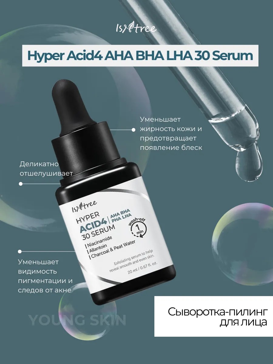 IsNtree Hyper Acid4 AHA BHA PHA LHA 30 Serum peeling serum exfoliates the stratum corneum, cleanses pores, prevents oily shine and comedones.
