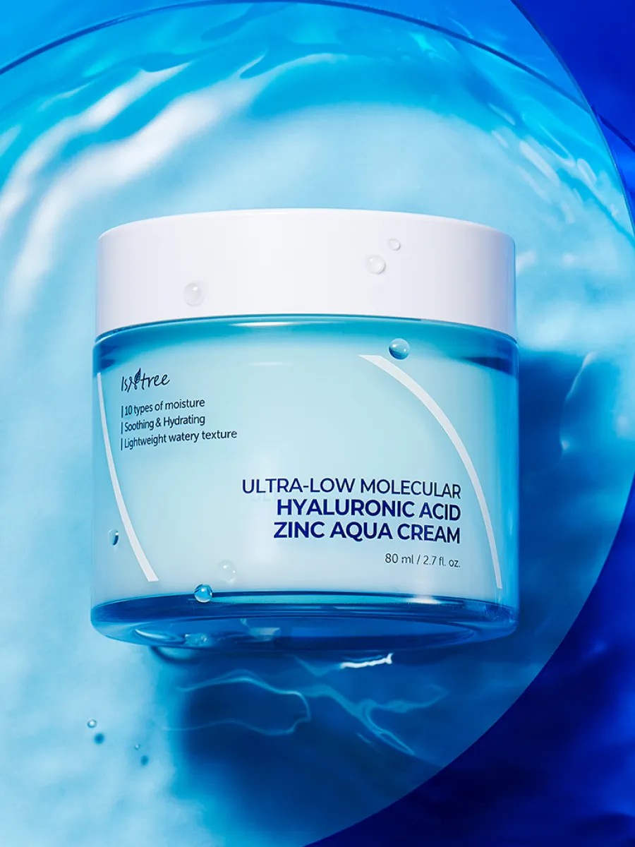 IsNtree Ultra-Low Molecular Hyaluronic Acid ZincAqua Cream, a moisturizing and soothing barrier cream for dehydrated skin, contains low-molecular hyaluronic acid. It instantly replenishes moisture in skin cells, saturates with moisturizing agents, and restores tone, healthy color, and radiance. It soothes irritation, restores and softens rough and flaky areas, provides comfort, and eliminates tightness.
