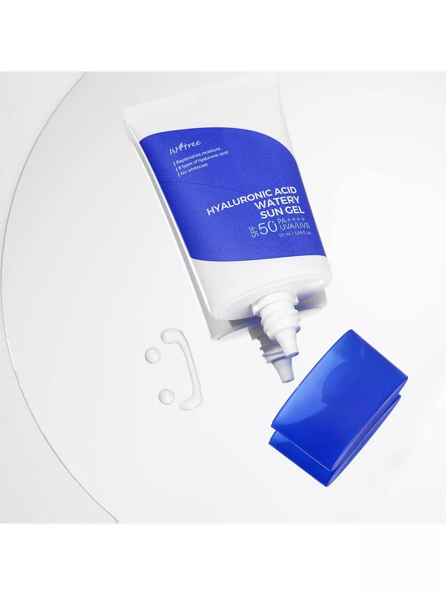 Cолнцезащитный гель IsNtree Hyaluronic Acid Watery Sun Gel SPF50+/PA++++ 50ml легкий увлажняющий солнцезащитный гель на основе мягких химических фильтров обеспечивает не только надёжную защиту от пагубного воздействия УФ-лучей, но и полноценно насыщает кожу необходимой влагой и помогает удерживать её, а также оказывает успокаивающее действие на раздражённую кожу.
