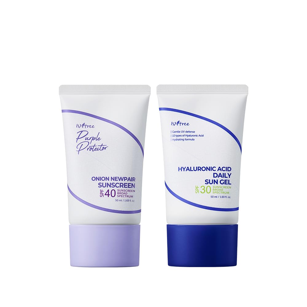 ISNTREE Sunscreen SET ( SPF40 SPF30 ). ISNTREE Hyaluronic Acid Daily Sun Gel 50ml, 1.69 fl oz SPF 30 PA Moisturizing Sunscreen No White Cast Lightweight Mild Formula Korean Skincare. ISNTREE Onion Newpair Sunscreen 50ml, 1.69 fl oz SPF 40 PA Hydrating Sun Protector Evens Skin Tone Korean Skincare.