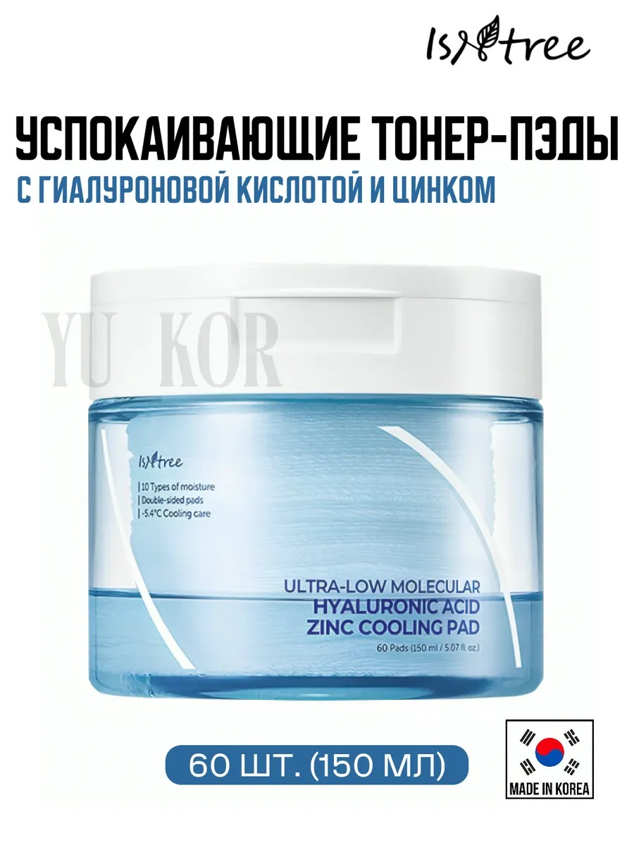 Увлажняющие пэды с охлаждающим эффектом IsNtree Ultra-Low Molecular Hyaluronic Acid Zinc Cooling Pad снижают температуру кожи на ~5,4°C, успокаивают раздражение и избавляют от ощущения стянутости. Пэды восполняют недостаток влаги, за счёт чего предотвращают шелушение и сухость. Разглаживают рельеф, смягчают, борются с покраснением и эритемой. Содержат 11 видов гиалуроновой кислоты, цинк, пантенол, морскую воду, аллантоин, глицерил глюкозид, бетаин и экстракт центеллы.