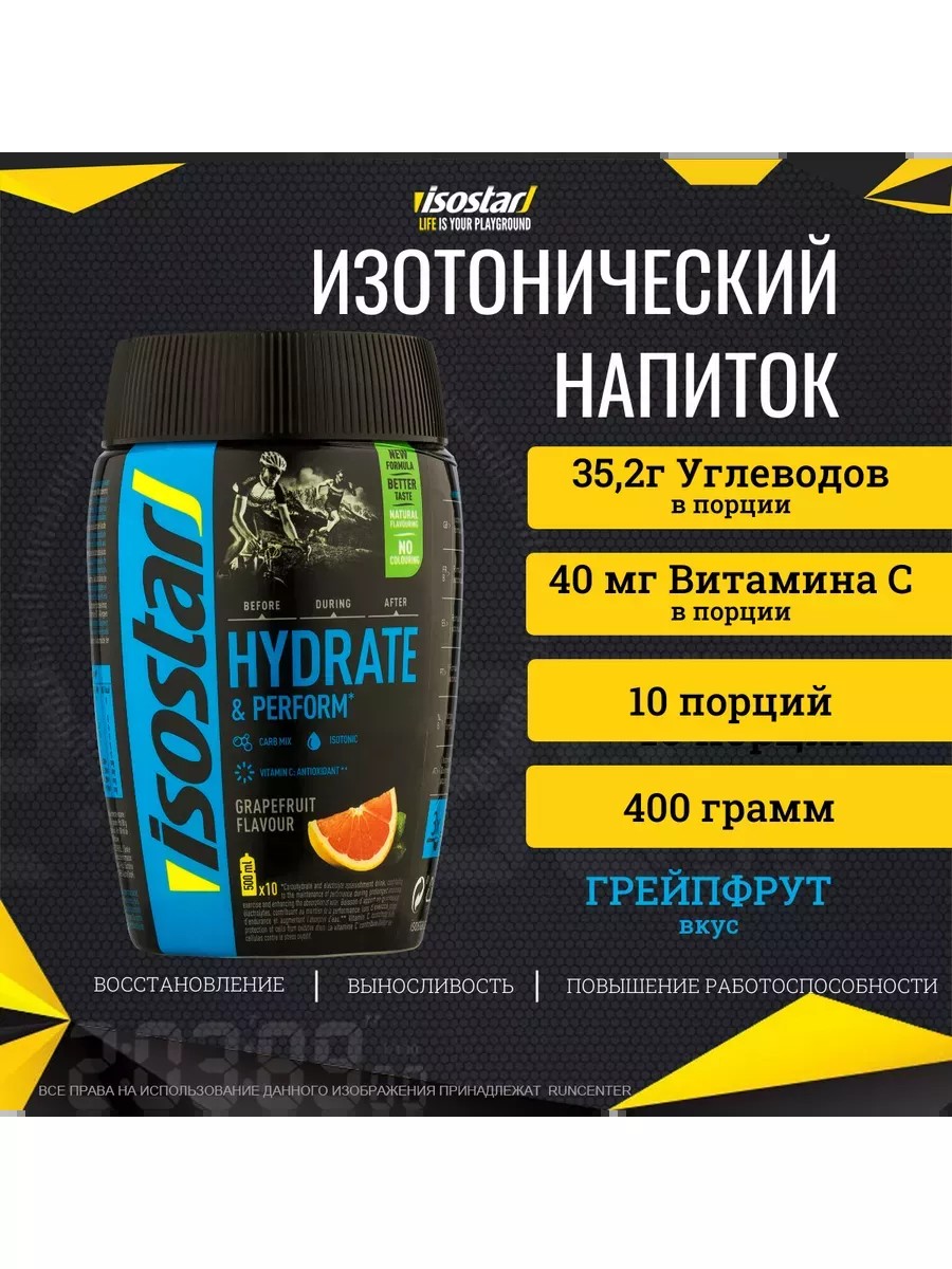Изотонический напиток со вкусом грейпфрута Isostar Hydrate & Perform предназначен для приготовления углеводных и электролитных напитков, чтобы обеспечить спортсмена необходимым количеством жидкости и энергии до и во время тренировки. Специальная изотоническая формула спортивного напитка обеспечивает более быстрое всасывание жидкости в организме. Питье перед тренировкой обеспечит вас необходимым запасом жидкости. Потребление жидкости во время упражнений поможет улучшить работоспособность и выносливость за счет снижения риска желудочно-кишечных проблем. Применение продукта после загрузки обеспечит лучший процесс восстановления.