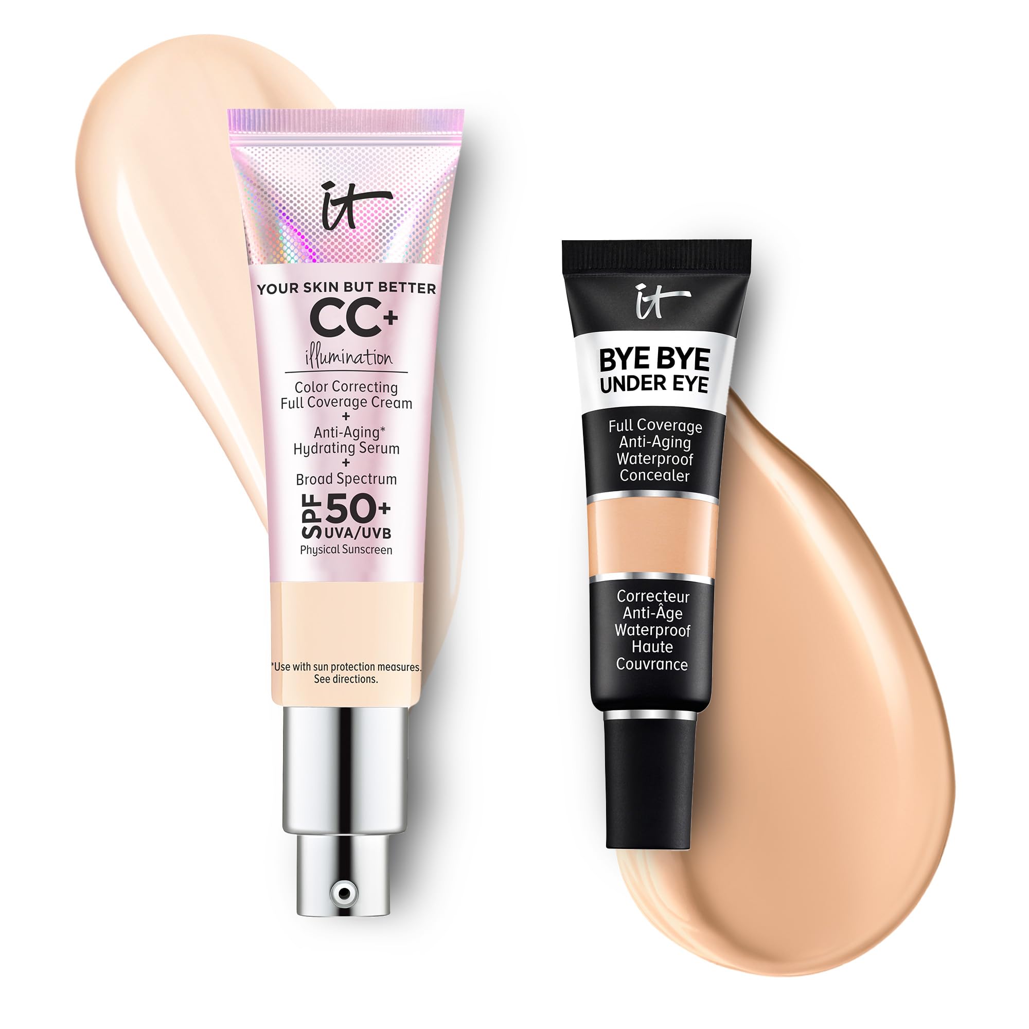 IT Cosmetics CC+ Cream Illumination with SPF 50+ Radiant Full Coverage Foundation (Fair Light- 1.08 fl oz) & Bye Bye Undereye Concealer Anti-Aging Makeup (14.5 Light Buff - 0.4 fl oz)