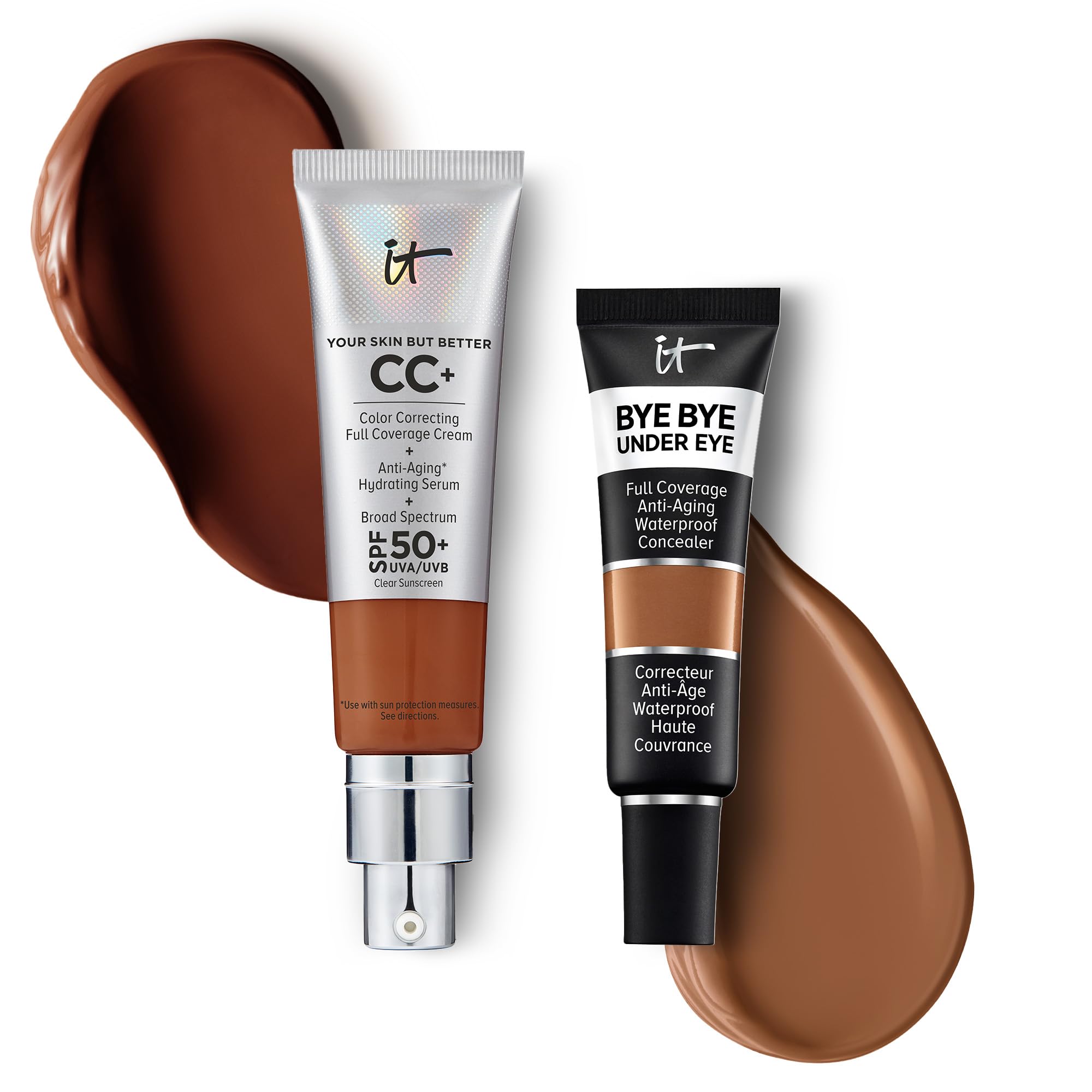 IT Cosmetics CC+ Cream with SPF 50+ Natural Finish Full Coverage Foundation (Deep - 1.08 fl oz) & Bye Bye Undereye Concealer Anti-Aging Makeup (43.0 Deep Honey - 0.4 fl oz)