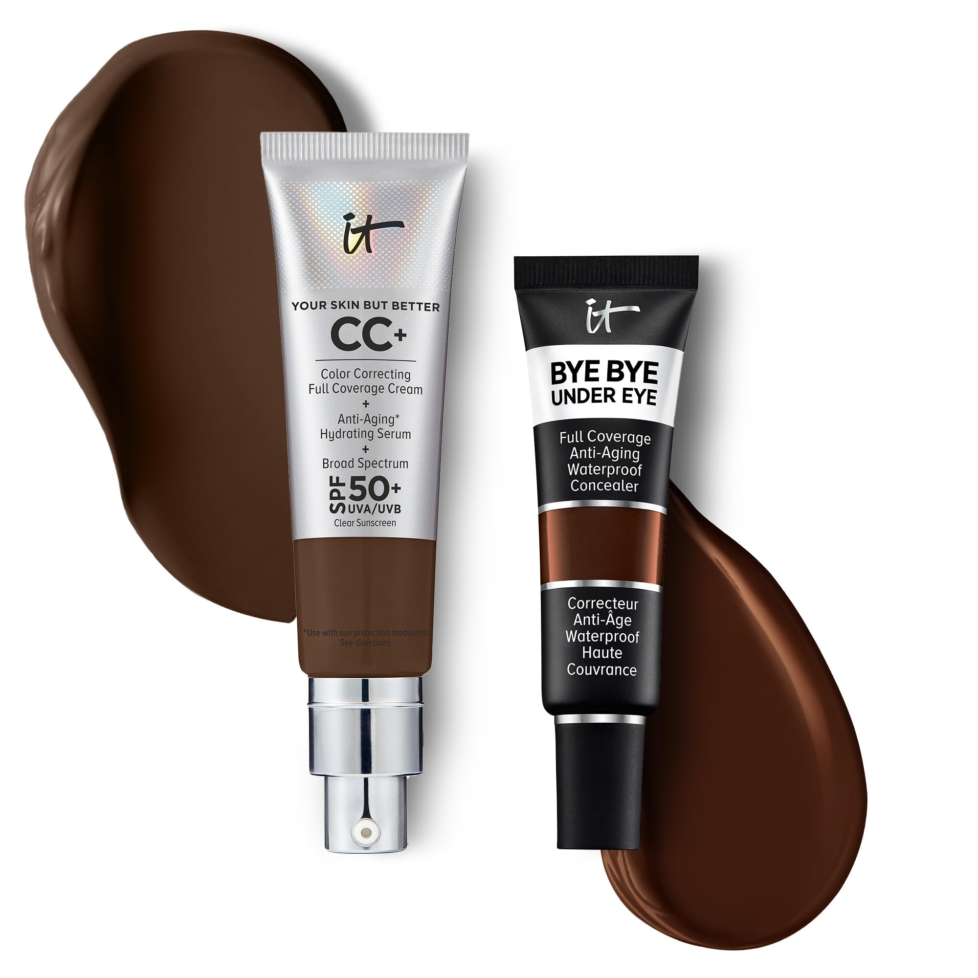 IT Cosmetics CC+ Cream with SPF 50+ Natural Finish Full Coverage Foundation (Deep Cool - 1.08 fl oz) & Bye Bye Undereye Concealer Anti-Aging Makeup (45.5 Deep Ebony - 0.4 fl oz)