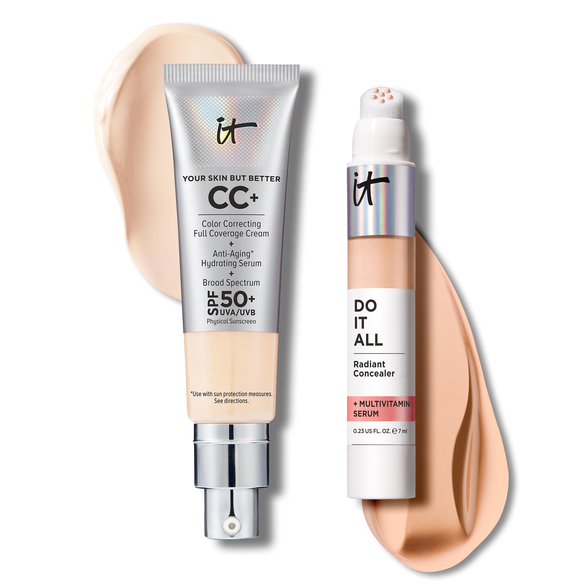 IT Cosmetics CC+ Cream with SPF 50+ Natural Finish Full Coverage Foundation (Fair Light - 1.08 fl oz) & Do It All Radiant Concealer Multivitamin Serum Makeup (210 Light Neutral - 0.2 fl oz)