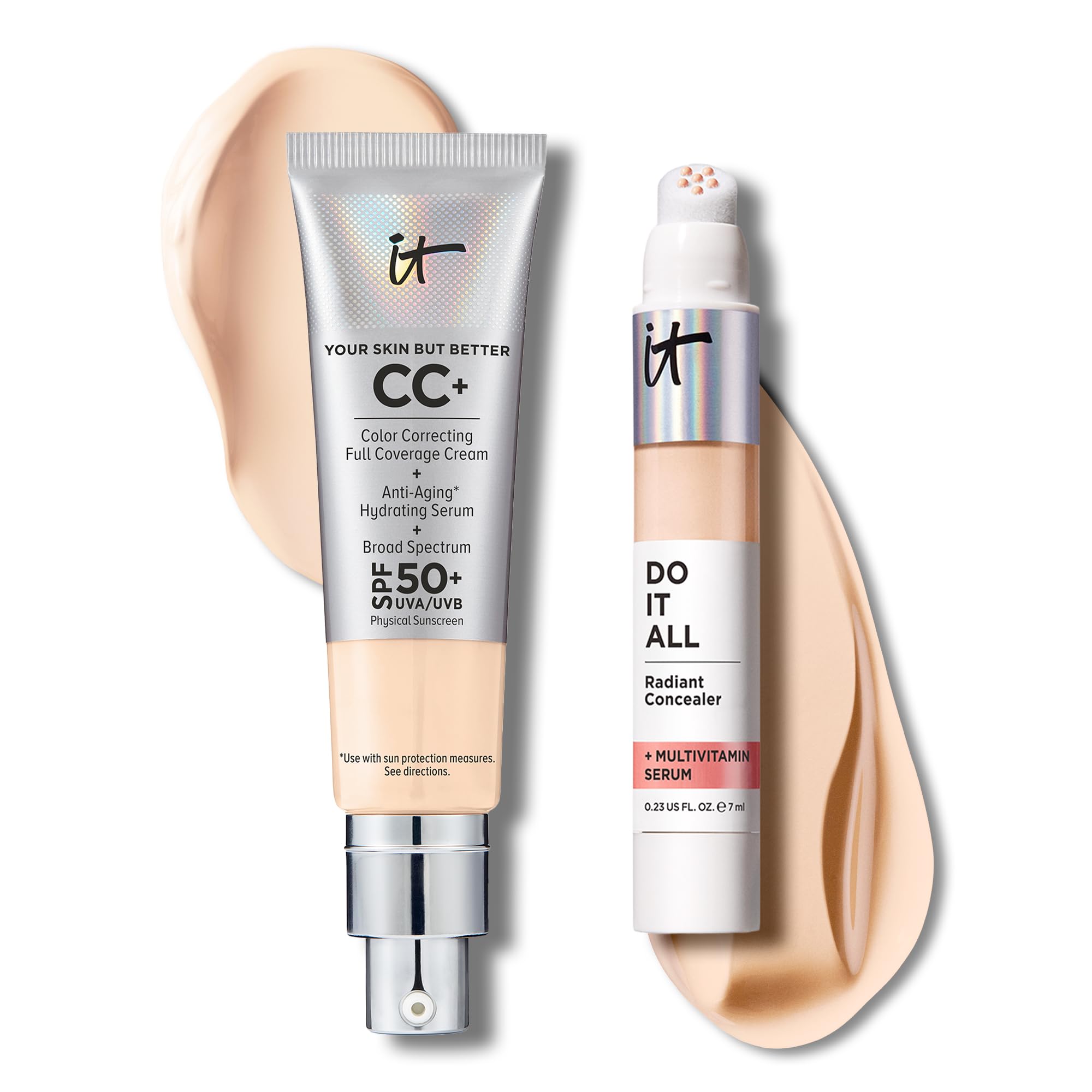 IT Cosmetics CC+ Cream with SPF 50+ Natural Finish Full Coverage Foundation (Fair Warm - 1.08 fl oz) & Do It All Radiant Concealer Multivitamin Serum Makeup (120 Fair Warm - 0.2 fl oz)