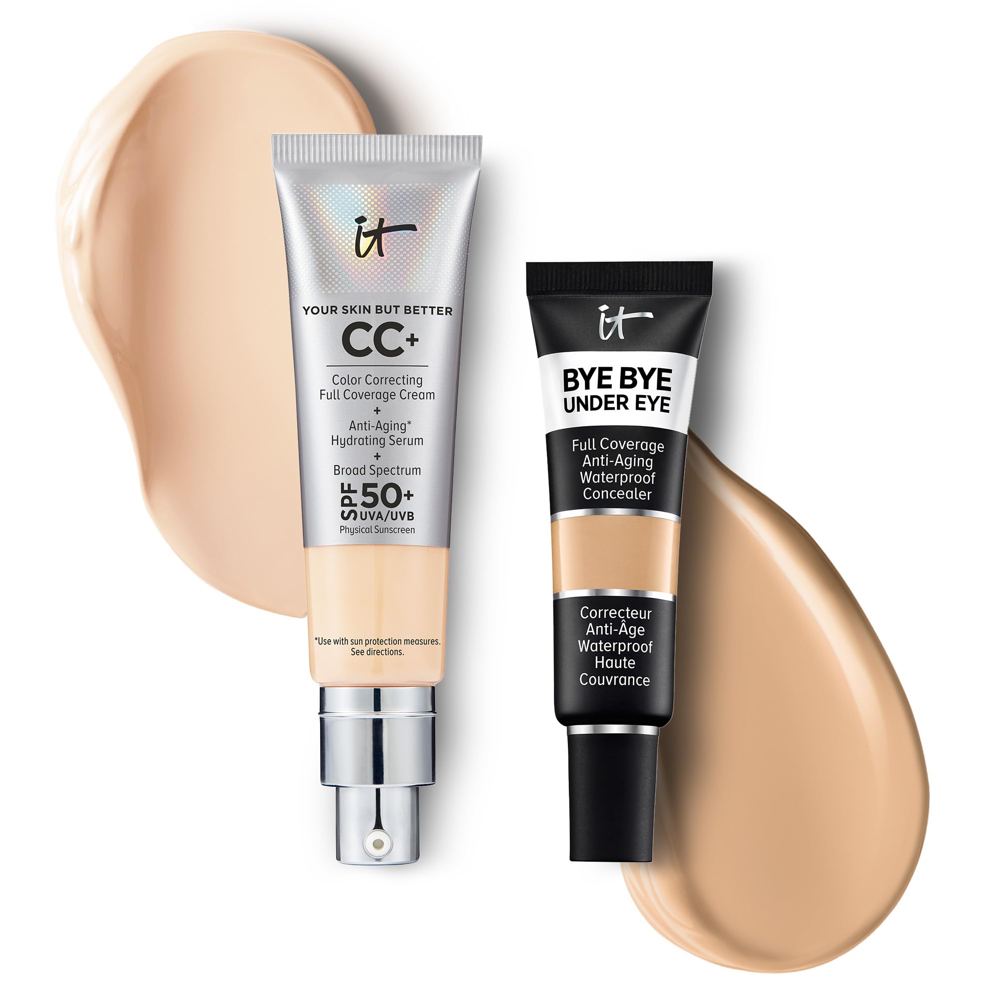 IT Cosmetics CC+ Cream with SPF 50+ Natural Finish Full Coverage Foundation (Light - 1.08 fl oz) & Bye Bye Undereye Concealer Anti-Aging Makeup (21.5 Medium Nude - 0.4 fl oz)